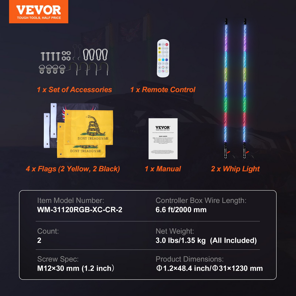 VEVOR 2 PCS 4 FT Whip Light, APP y control remoto RF Led Whip Light, Impermeable 360 ° Espiral RGB Chasing Lighted Whispers con 4 banderas, para UTV, ATV, motocicletas, RZR, Can-am, camiones, todoterreno, Go-karts
