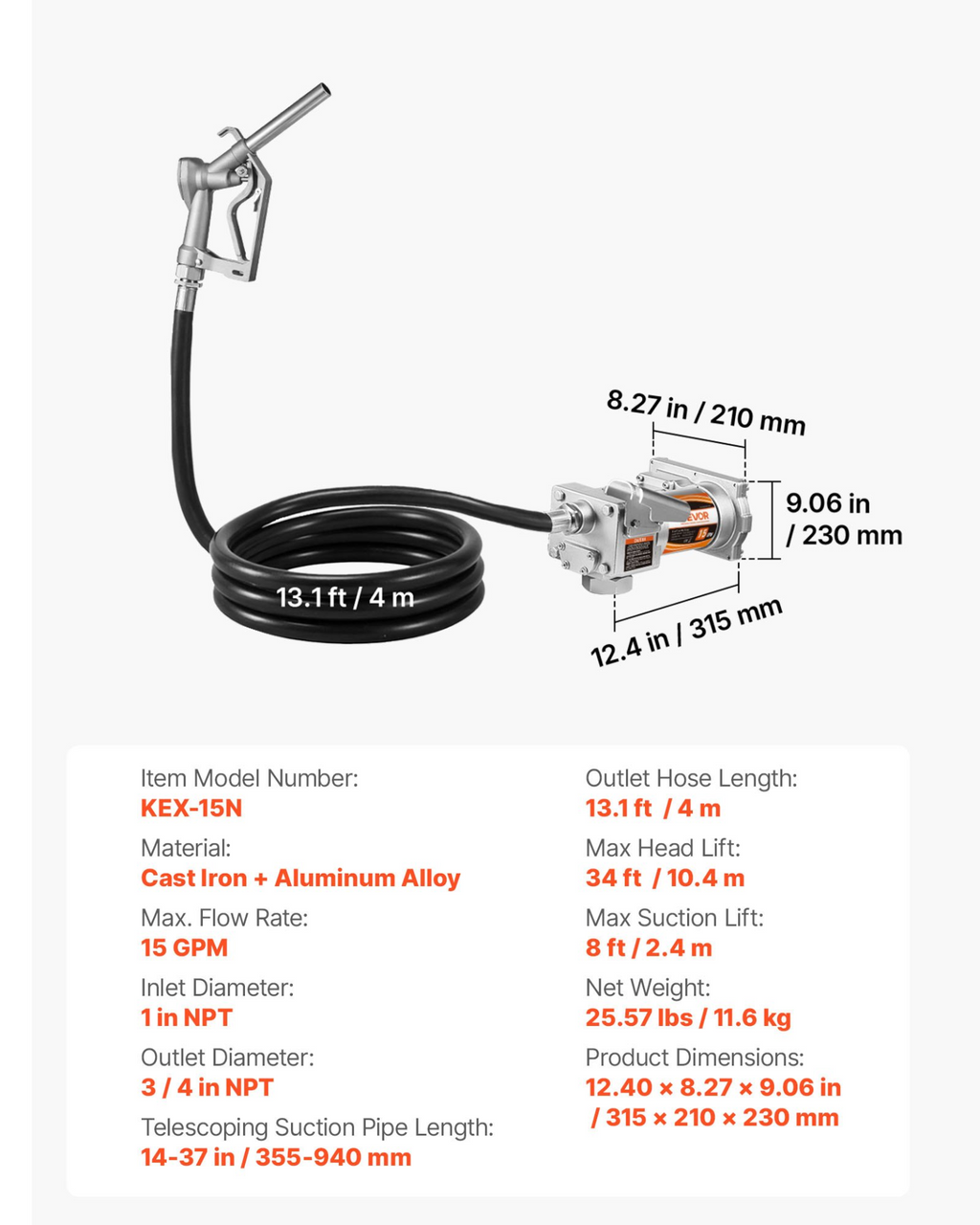Longitud de la manguera de salida: 4 m (13,1 pies). Caudal máximo: 15 GPM. Diámetro de entrada: 1 pulg. NPT. Diámetro de salida: 3/4 pulg. NPT. Elevación máxima: 10 m (33 pies). Número de modelo: KEX-15N. Longitud del tubo de succión telescópico: 355-940 mm (14-37 pulg.). Material: Hierro fundido y aleación de aluminio. Elevación máxima de succión: 2,4 m (8 pies).