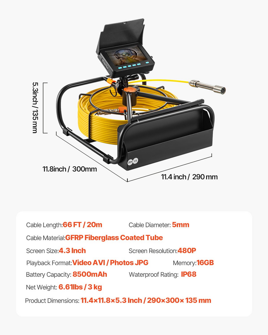 VEVOR Sewer Camera, 66ft/20M 4.3" Pipe Drain Inspection Camera with DVR Function & Snake Cable, Waterproof IP68 Borescope w/LED Lights, Industrial Endoscope for Home Wall Duct Drain Pipe Plumbing
