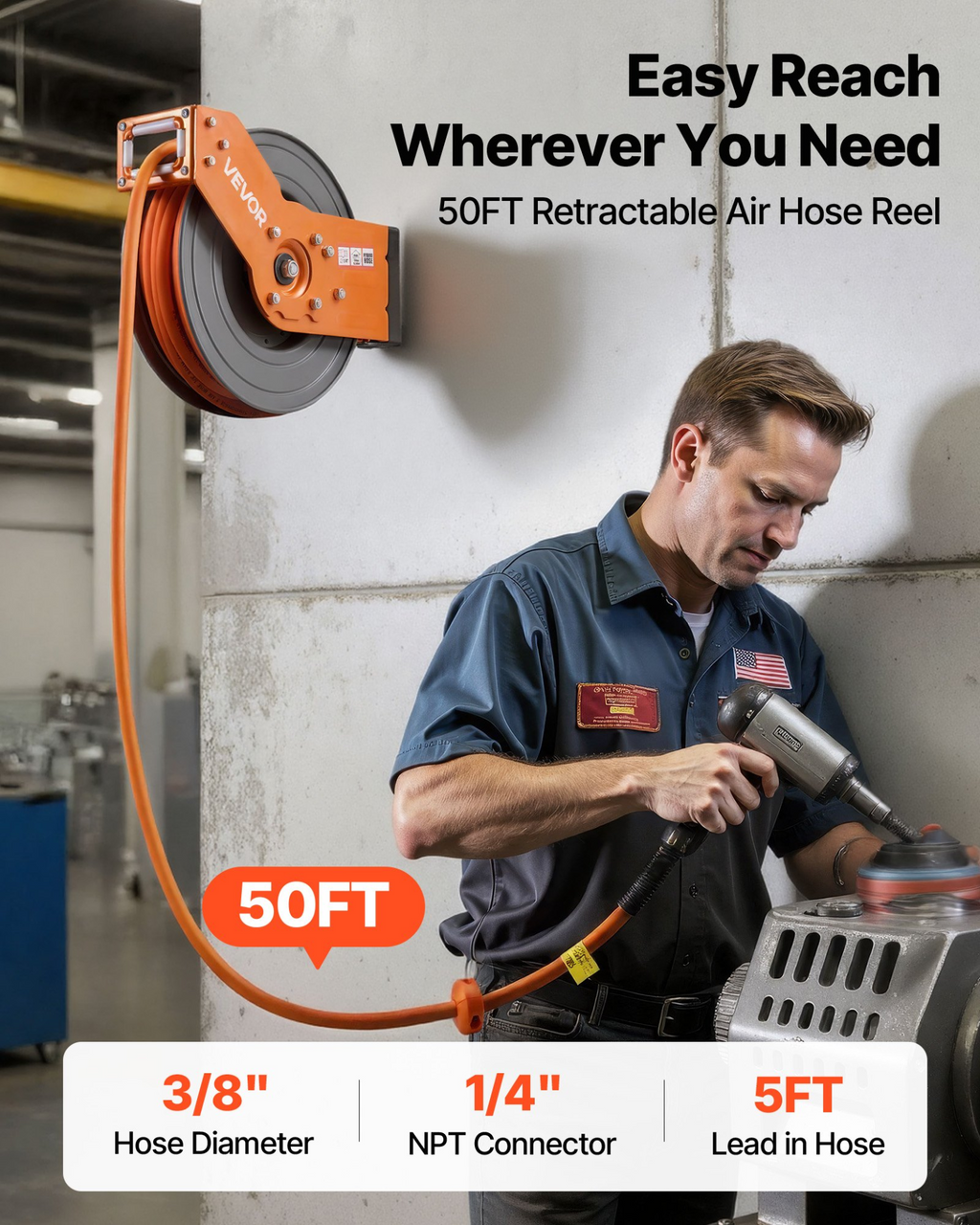 Carrete de manguera de aire retráctil VEVOR, manguera de aire híbrida de 3/8" x 50 pies, máx. 300 PSI, rebobinado automático