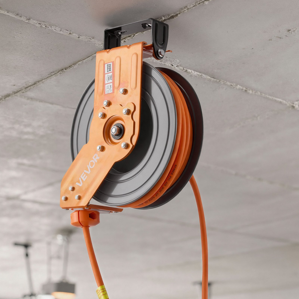Carrete retráctil para manguera de aire VEVOR, manguera híbrida de 3/8" x 50 pies, máx. 300 PSI, con rebobinado automático para compresor de aire con entrada de 5 pies, montaje en techo o pared giratorio de 180° para talleres.