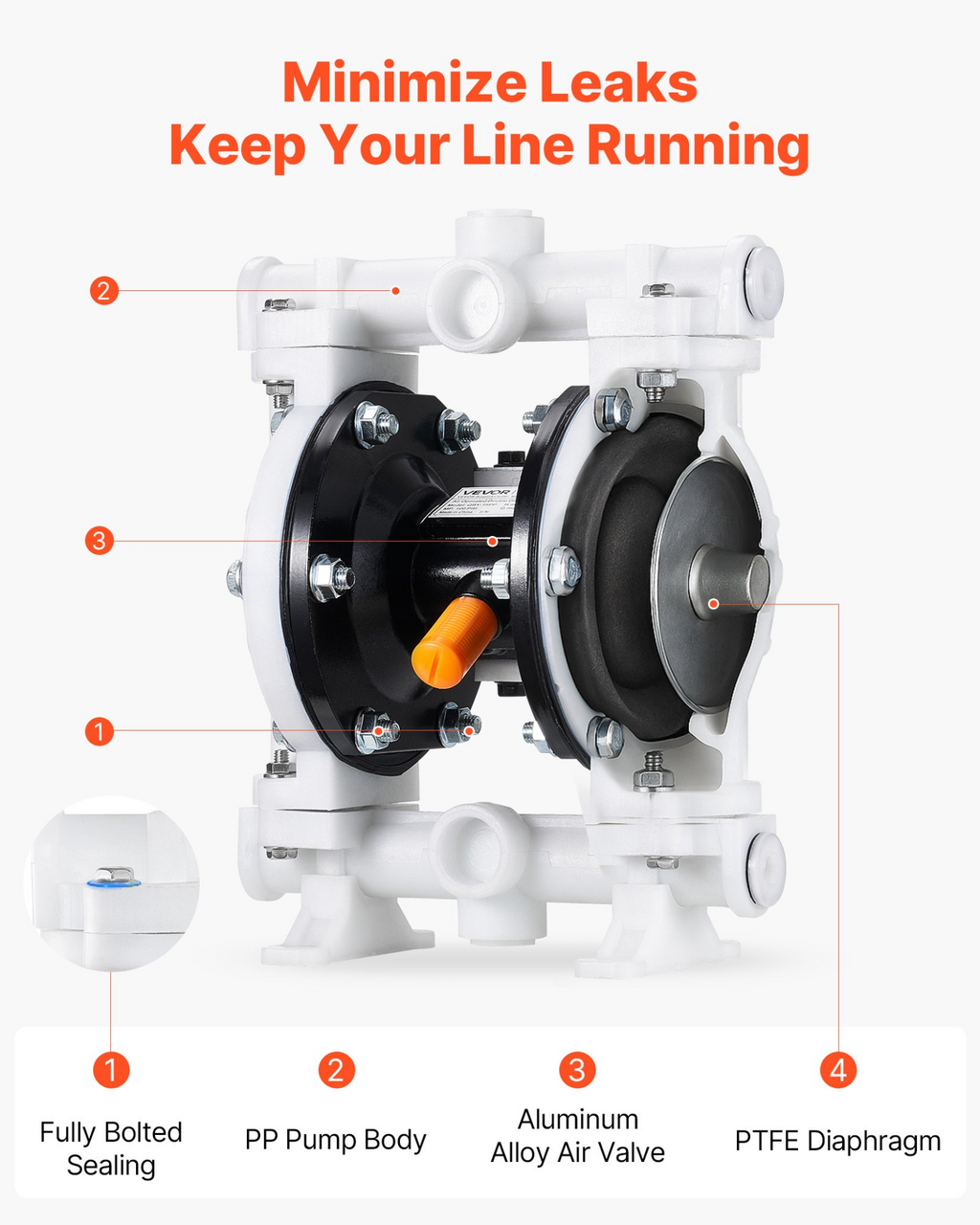 Bomba neumática de doble diafragma VEVOR, 4.4 GPM, entrada y salida de 1-1/2 pulgadas, bomba neumática para transferencia de aceite usado, máx. 100 PSI, cuerpo de polipropileno, accionada por aire para diésel, grasa, queroseno, gasolina,