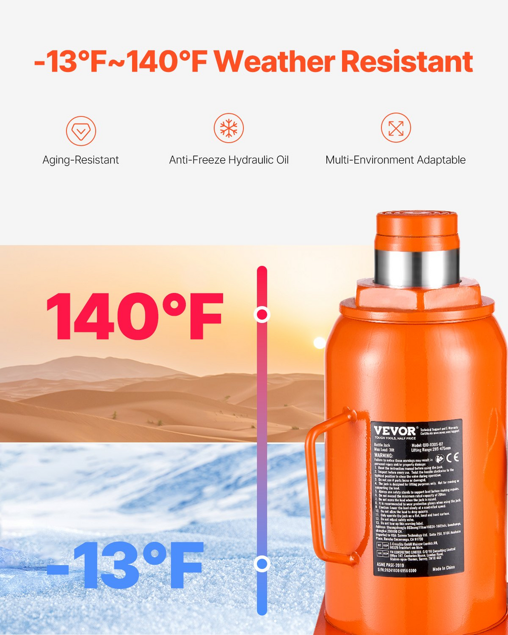 duraderos. Resistente a la intemperie. Peso neto (todos los accesorios incluidos): 34.8 lb/15.8 kg. Número de modelo: QJD-030S-02. Capacidad máxima: 30 t. Dimensiones: 6.7 x 5.3 x 11.2 in/170 x 135 x 285 mm. Rango de elevación: 11.22-18.66 in/285-475 mm.