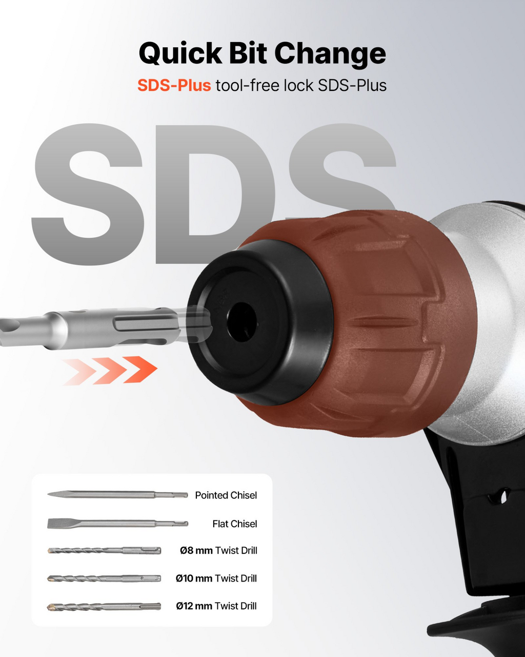 Taladro percutor VEVOR, martillo percutor eléctrico SDS-Plus de 1-1/8" con cable, resistente, incluye 3 brocas, cincel plano, cincel puntiagudo