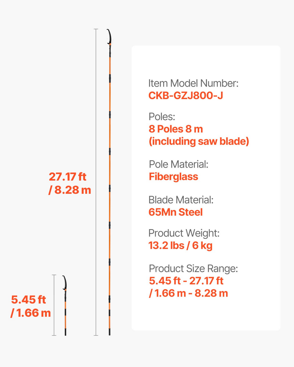 Pértigas: 8 secciones, 8 m (incluida la hoja). Material de la hoja: acero de 65 Mn. Material de la pértiga: fibra de vidrio. Número de modelo: CKB-GZJ800-J. Peso: 6 kg. Longitud: 1,36 a 8,03 m.