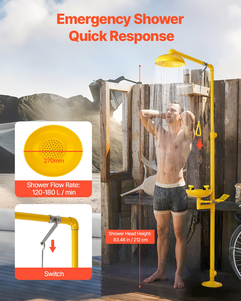 Estación lavaojos de emergencia VEVOR, 87,5 x 40,7 x 23,8 cm, acero inoxidable 304, combinación de ducha y lavaojos, estación de primeros auxilios aprobada por OSHA, para escuelas, laboratorios y fábricas, color amarillo.