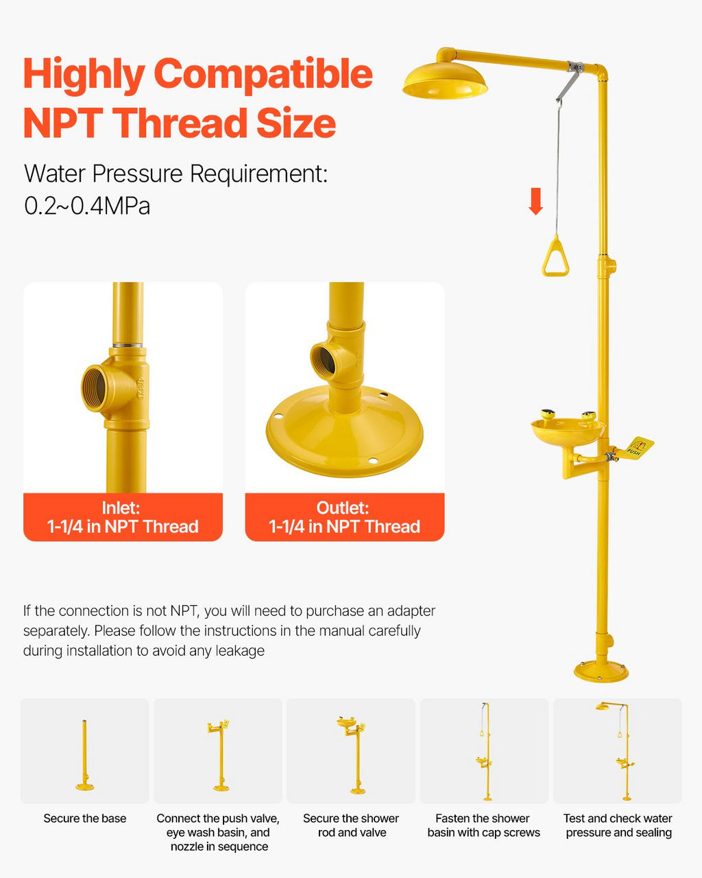 Método de instalación: montaje en suelo. Caudal del lavaojos: 9-16 l/min. Caudal de la ducha: 120-180 l/min. Presión de agua: 0,2-0,4 MPa. Color: amarillo. Diámetro del lavaojos: 27 cm. Número de modelo: YX-FH-D. Salida: rosca NPT de 1-1/4". Dimensiones: 870 x 400 x 2330 mm. Peso neto: 21,16 lbs / 9,6 kg, Material principal: Acero inoxidable SUS304, Entrada: Rosca NPT de 1-1/4"