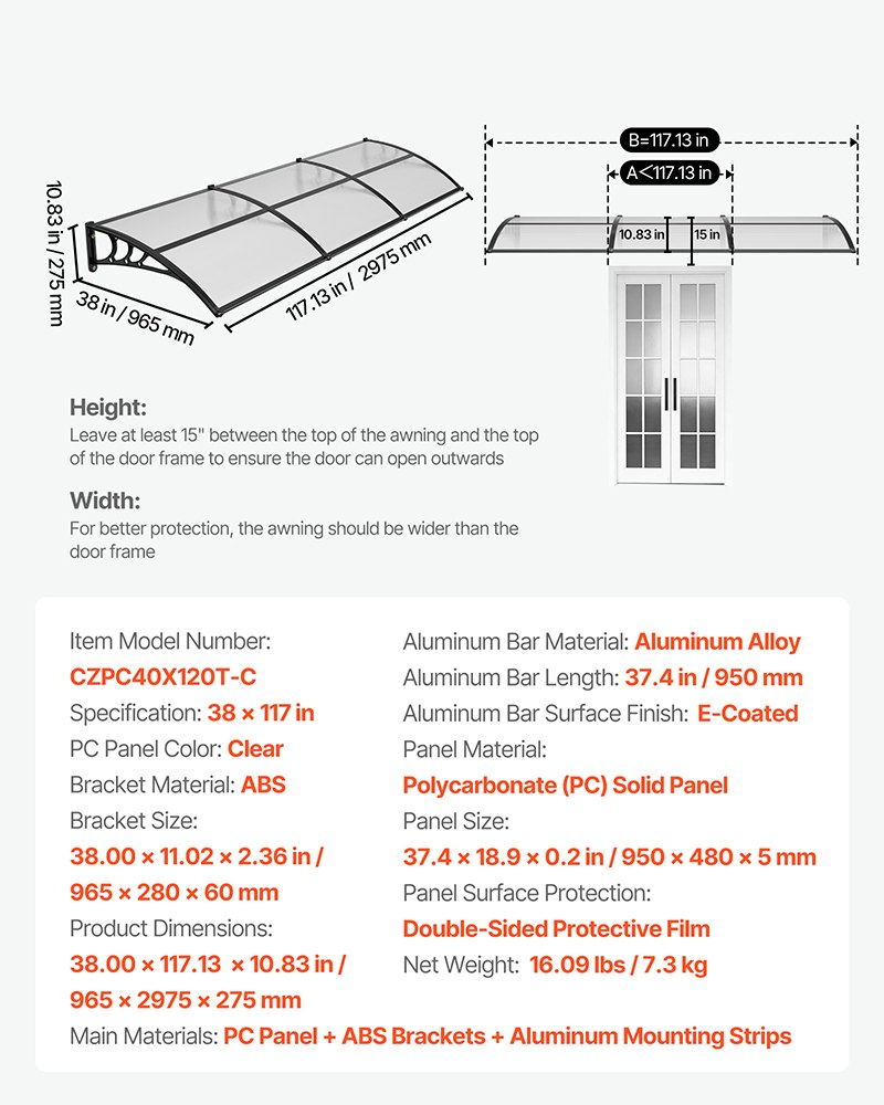 Toldos VEVOR para entrada, 96 x 290 cm, toldos exteriores para puerta delantera y ventana con drenaje y soporte de ABS, protección contra la lluvia, la nieve y el sol, marquesina de policarbonato para porche y patio,