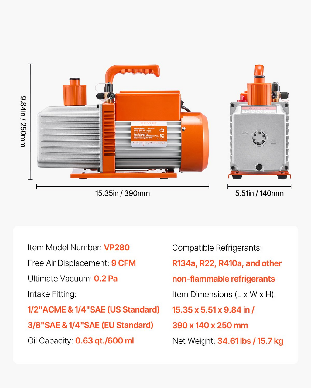 capacidad de aceite: 0.63 qt/600 ml, dimensiones del artículo (L x An x Al): 15.35 x 5.51 x 9.84 in / 390 x 140 x 250 mm, vacío máximo: 0.2 Pa, número de modelo del artículo: VP280, conexión de entrada: 1/2" ACME y 1/4" SAE, desplazamiento de aire libre: 9 CFM, peso neto: 34.61 lbs / 15.7 kg, potencia: 750 W, refrigerantes compatibles: R134a, R22, R410a y otros refrigerantes no inflamables