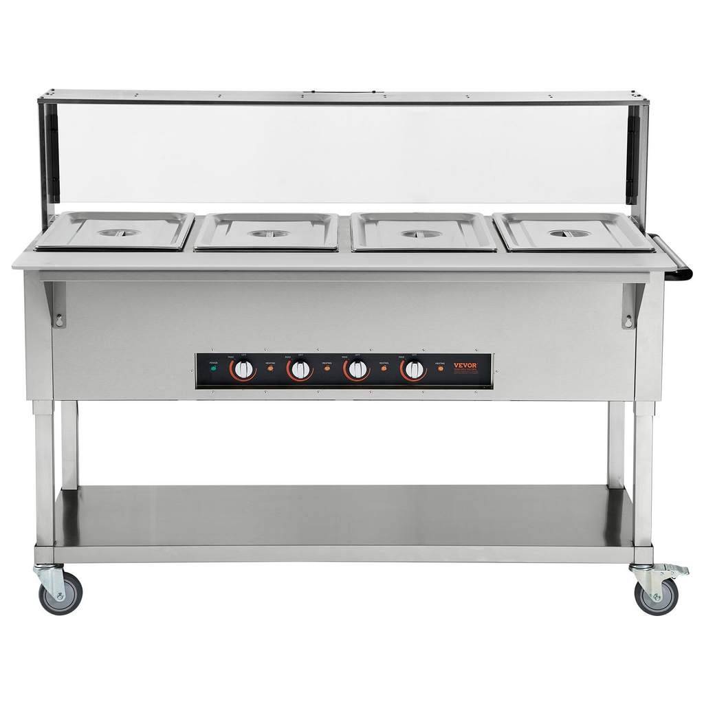 VEVOR Calentador de alimentos comercial de 4 sartenes, mesa de vapor eléctrica de 4 x 20,6 QT, calentador de alimentos profesional de catering tipo bufé de 2000 W con protector contra estornudos de acrílico, servidor de acero inoxidable de grado alimenticio para restaurantes de fiestas