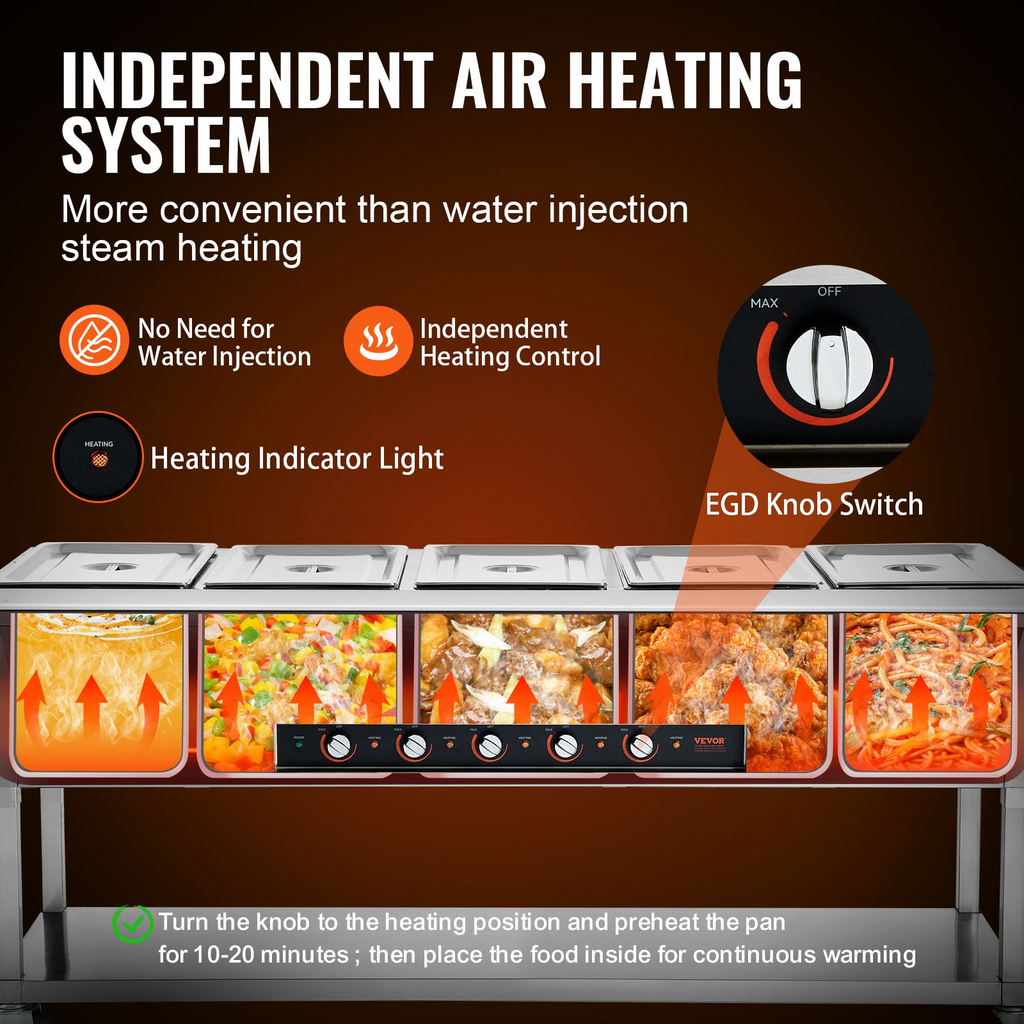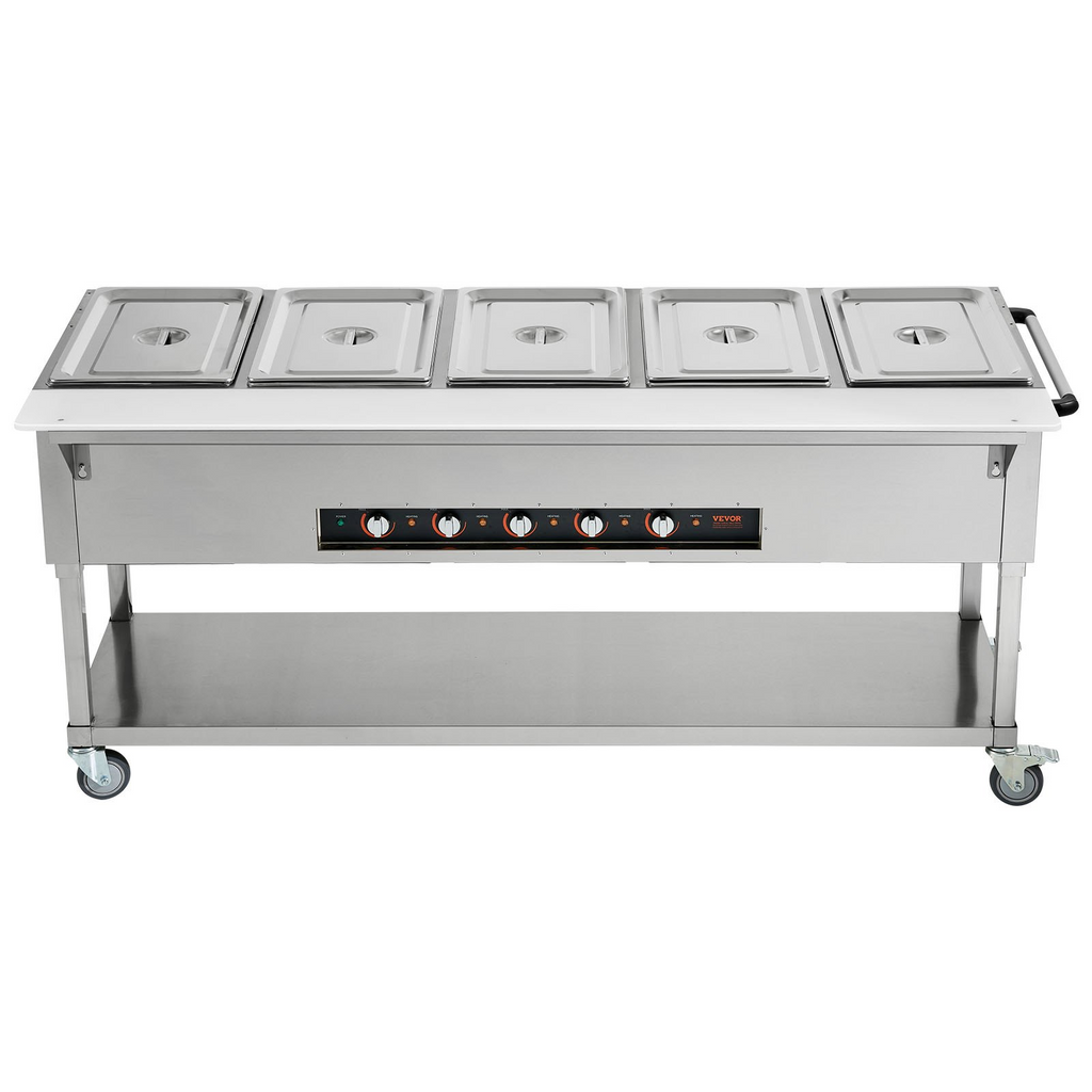 VEVOR Calentador de alimentos comercial de 5 sartenes, mesa de vapor eléctrica de 5 x 20.6QT, calentador de alimentos profesional de catering tipo bufé de 3750 W con 4 ruedas (2 bloqueables), servidor de acero inoxidable de grado alimenticio para restaurantes de fiestas