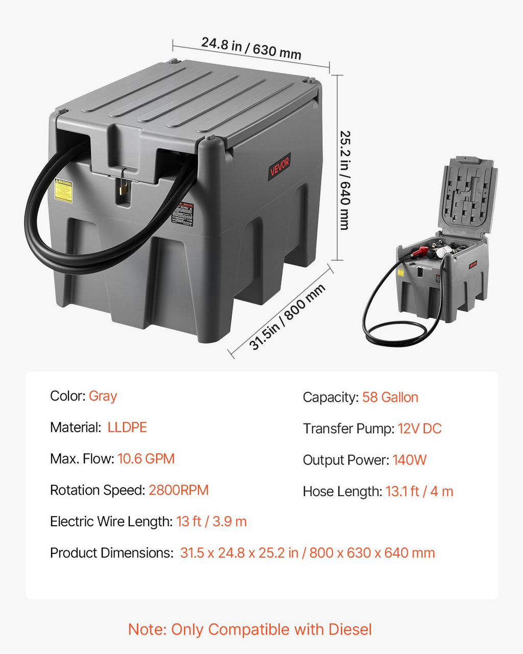Tanque diésel portátil VEVOR, capacidad de 58 galones y caudal de 10 GPM, con bomba de transferencia eléctrica de 12 V