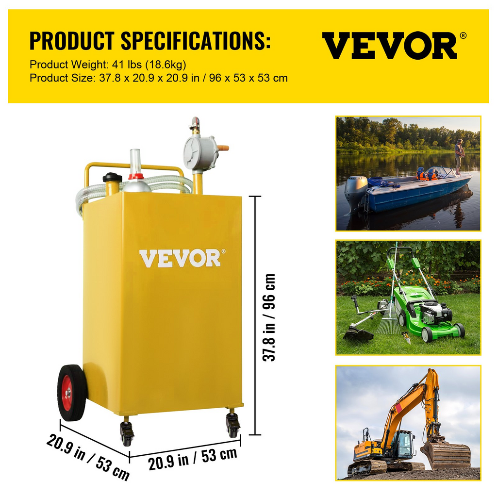 VEVOR - Tanque de combustible de 30 galones, tanque de almacenamiento de gasolina y 4 ruedas, con bomba de transferencia manual, contenedor de combustible diésel para automóviles, cortadoras de césped, vehículos todo terreno, barcos y más, amarillo.