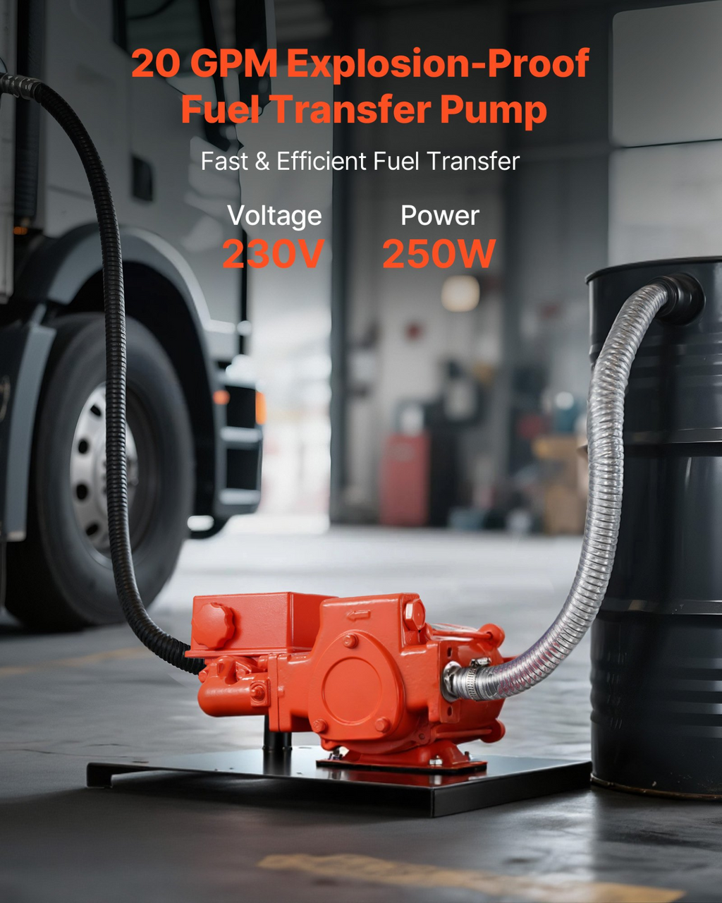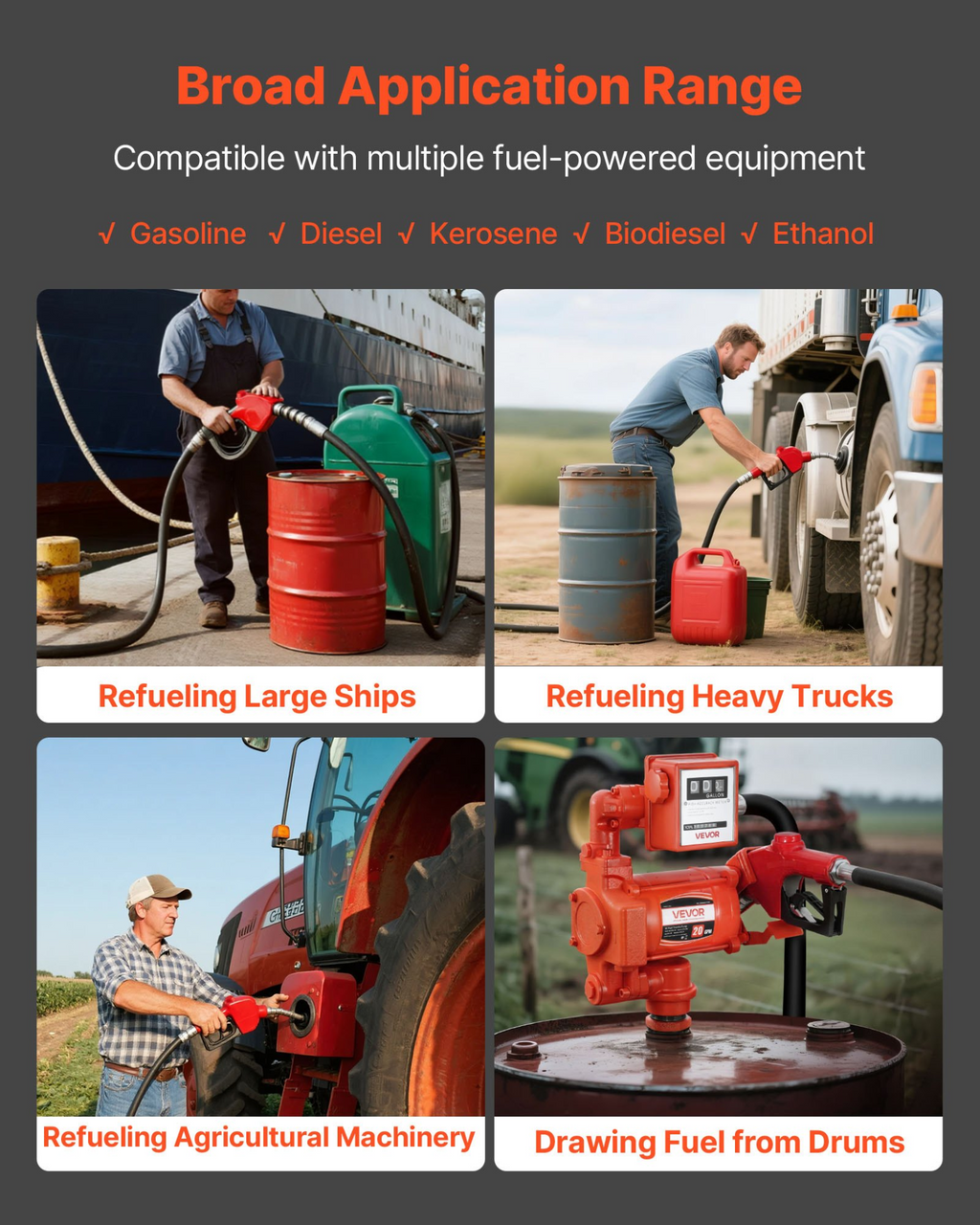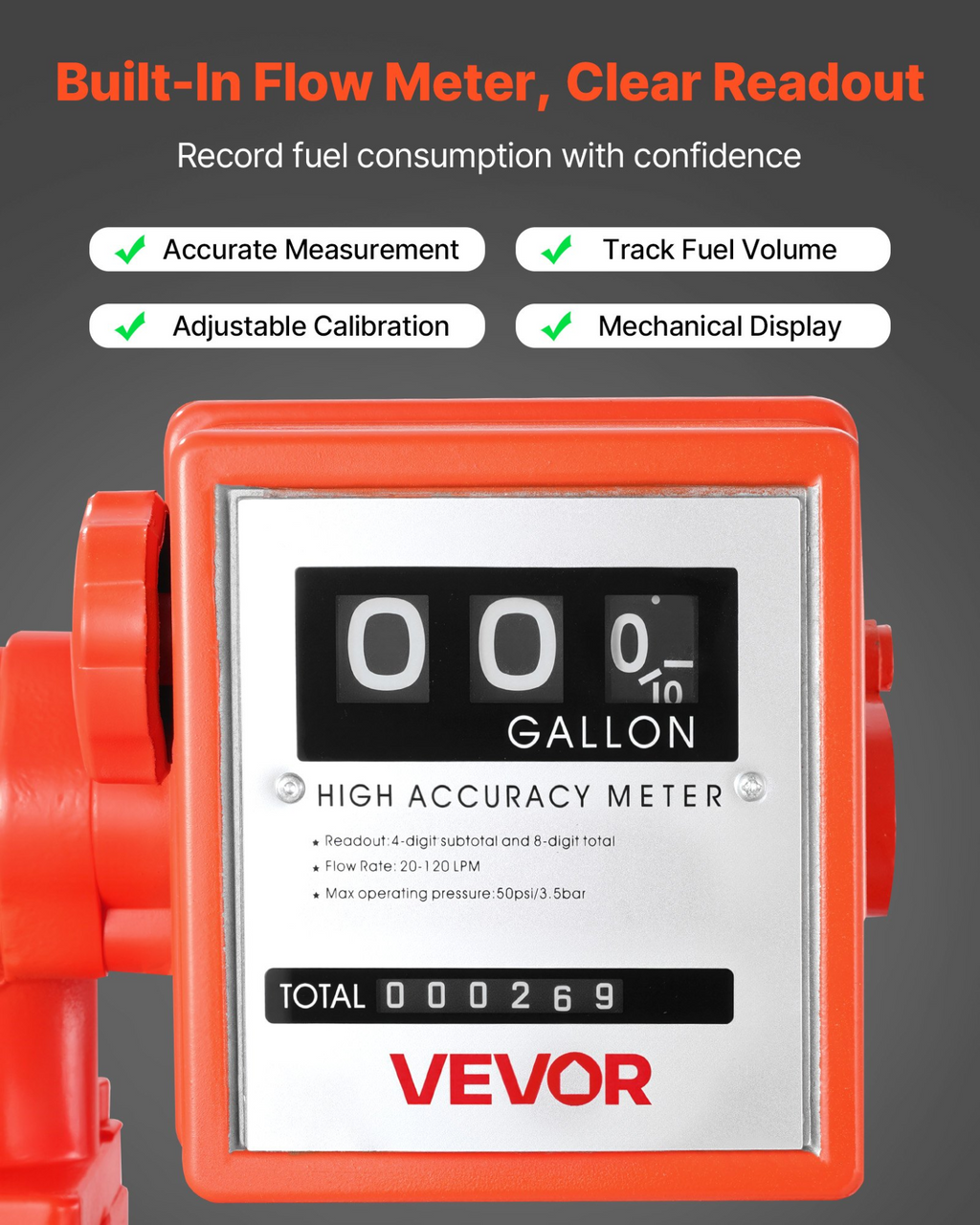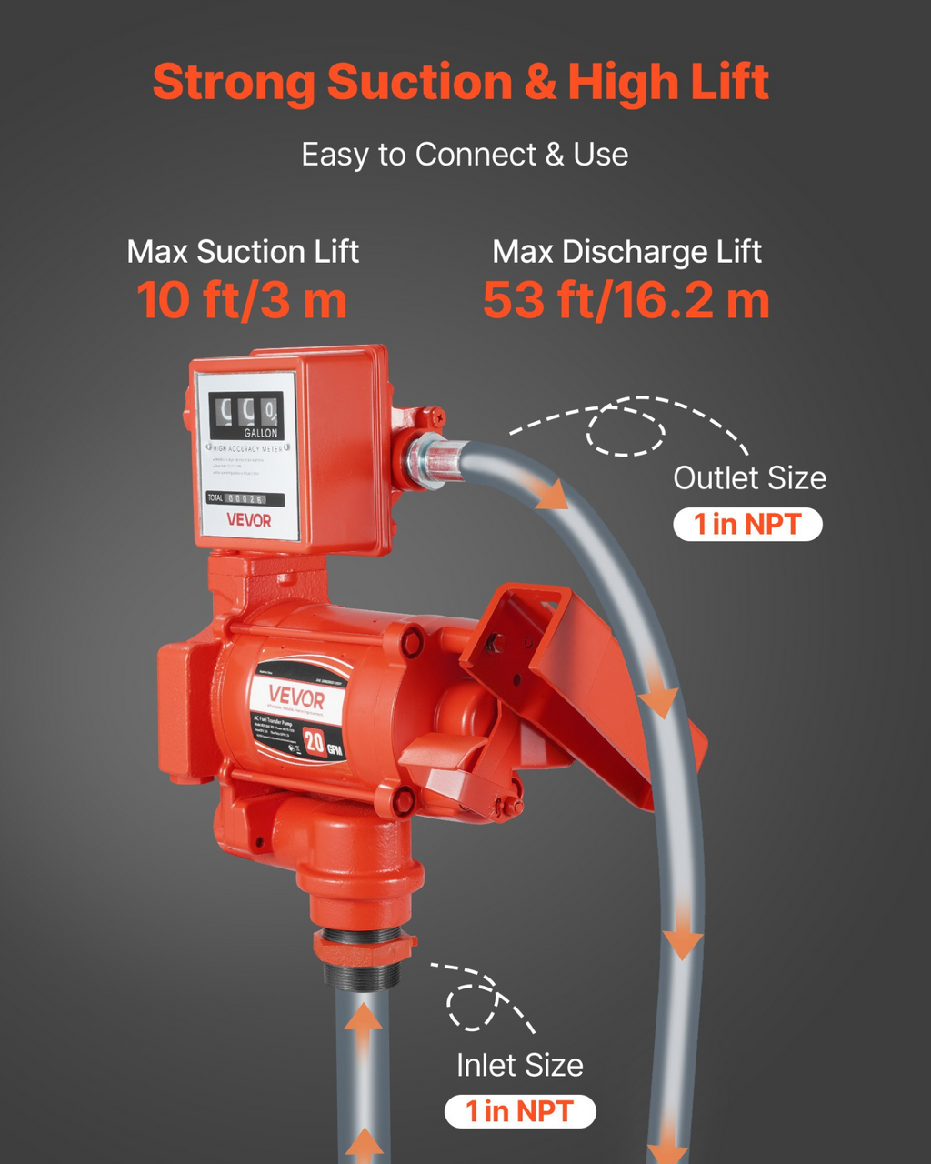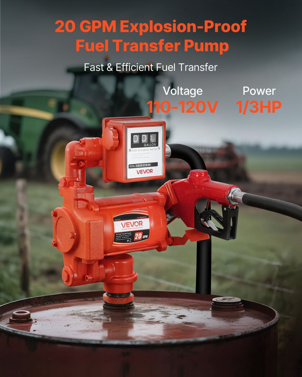 Bomba de transferencia de combustible VEVOR de 110 V, 20 GPM 76 L/min, bomba eléctrica de CA para transferencia de aceite, con medidor, boquilla de combustible con apagado automático y manguera de descarga, alto caudal para gasolina, diésel, queroseno, biodiésel y etanol.
