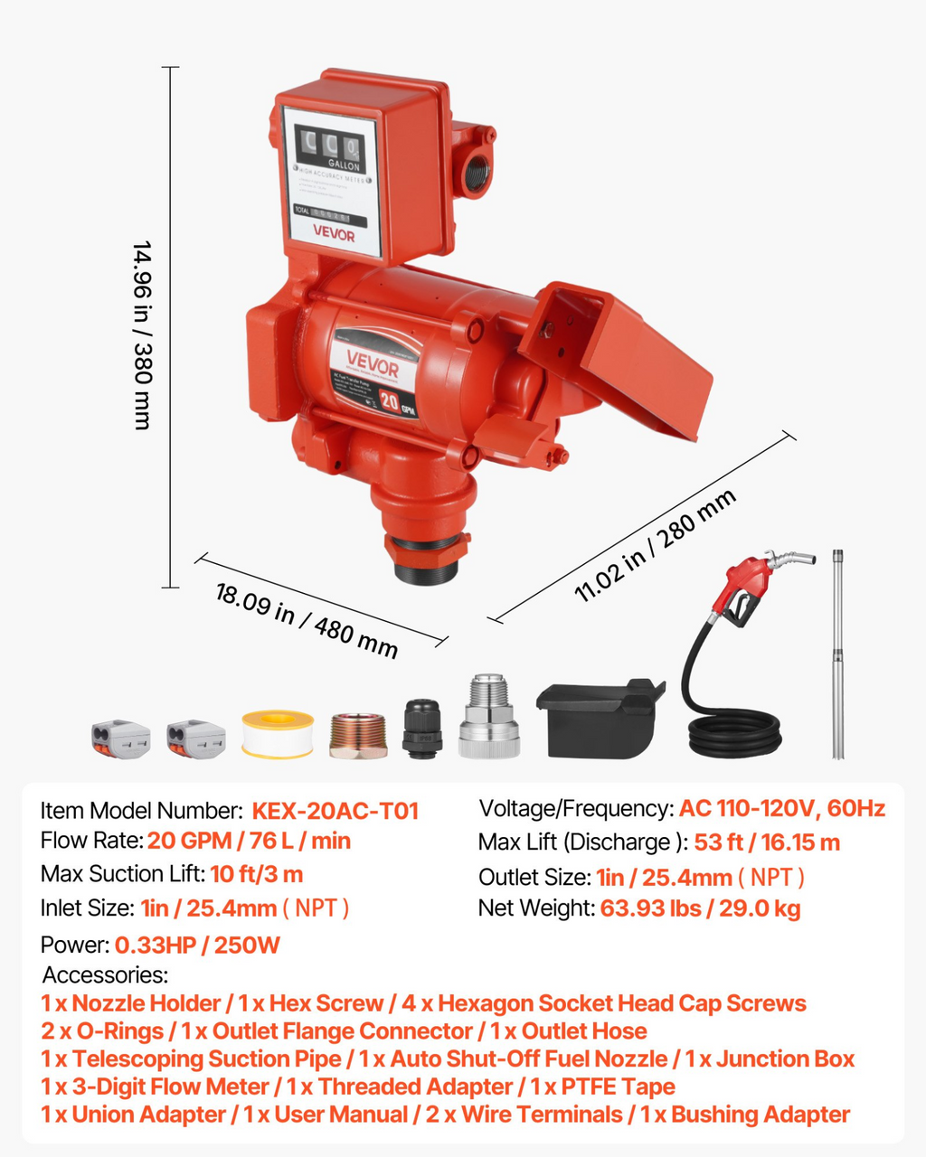 de fácil conexión. Caudal: 20 GPM/76 L/min. Voltaje/frecuencia: CA 110-120 V, 60 Hz. Número de modelo: KEX-20AC-T01. Elevación máxima (descarga): 53 pies/16,15 m. Potencia: 0,33 HP/250 W. Elevación máxima de succión: 10 pies/3 m.