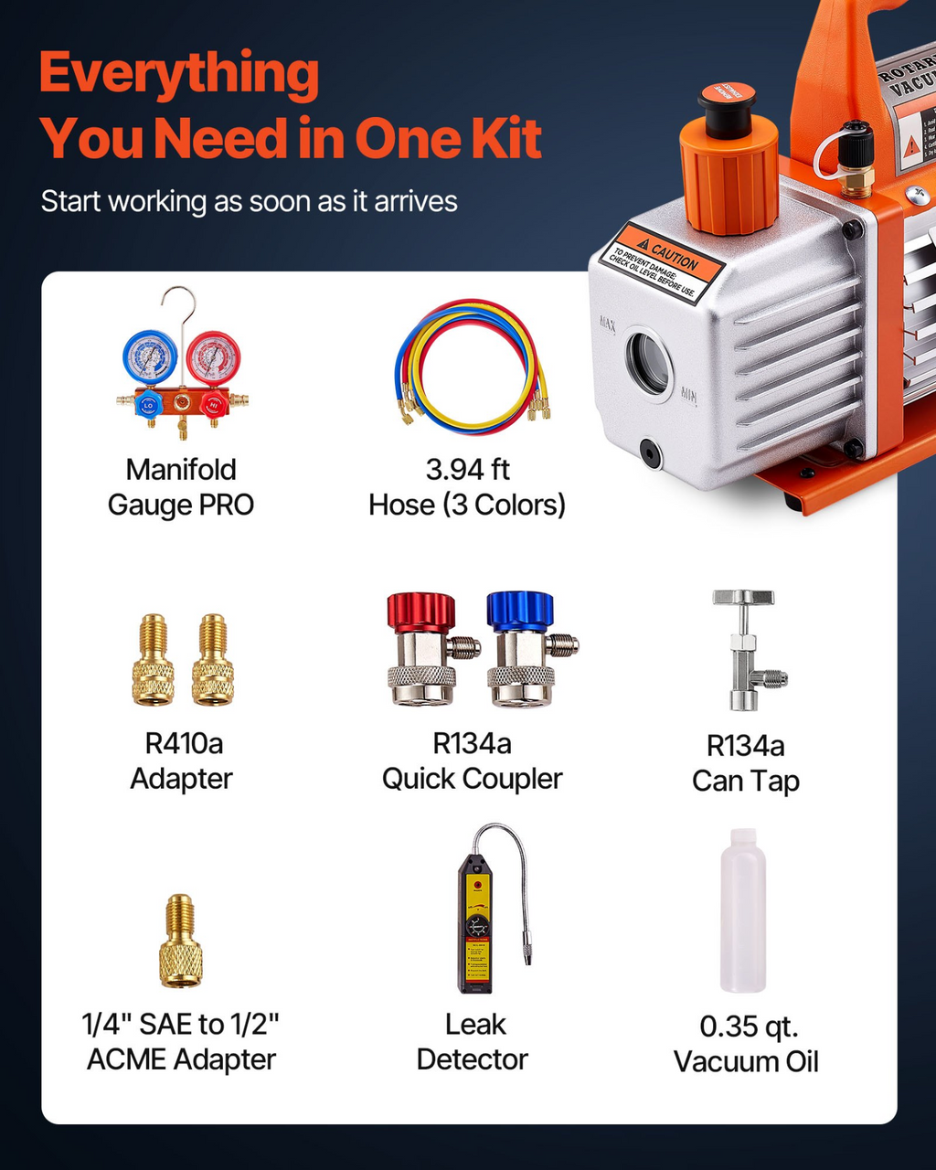 Bomba de vacío y manómetro VEVOR de 4 CFM para aire acondicionado, 1/3 HP, bomba de vacío de aire de paletas rotativas de una etapa para HVAC, kit de manómetro para colector de refrigerante de aire acondicionado, con detector de fugas y bolsa de transporte, para refrigerantes R134a, R22 y R410a.