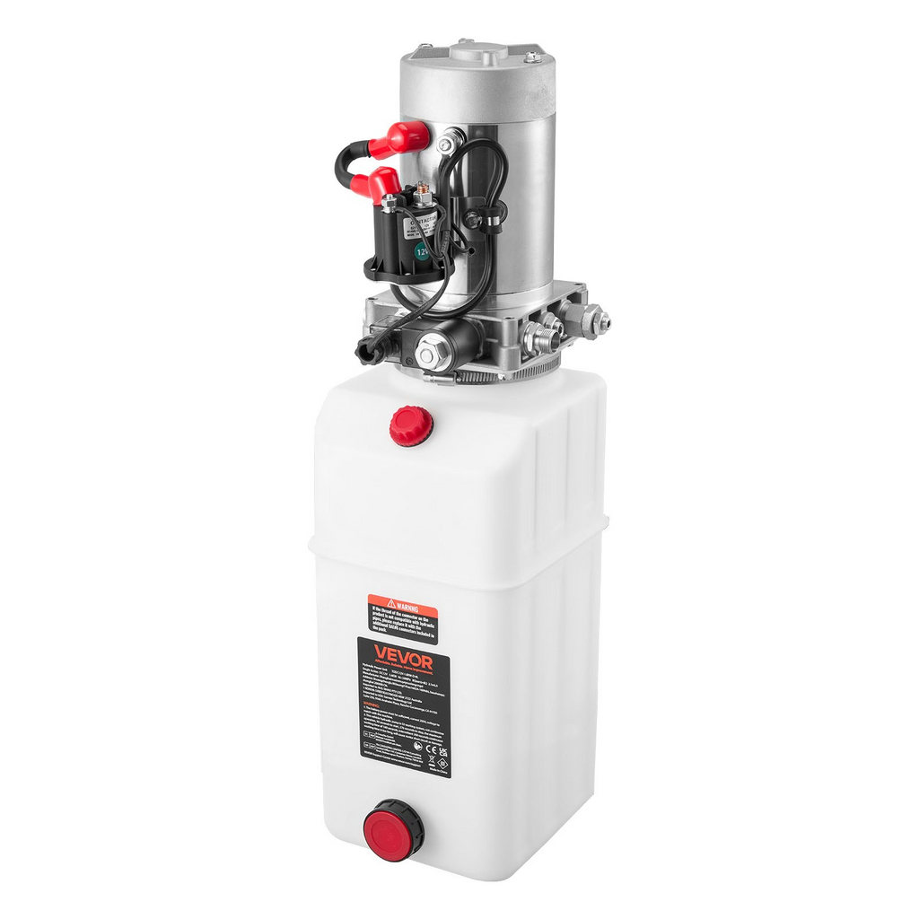 Bomba hidráulica VEVOR de 6 cuartos de galón, de simple efecto, para remolques volcadores, con presión máxima de alivio de 3200 PSI y caudal de 0,91 GPM, de 12 V CC con depósito metálico para elevación de vehículos con remolques volcadores, color blanco.