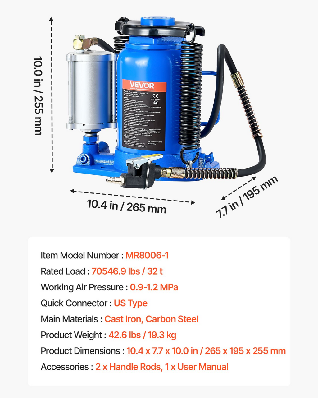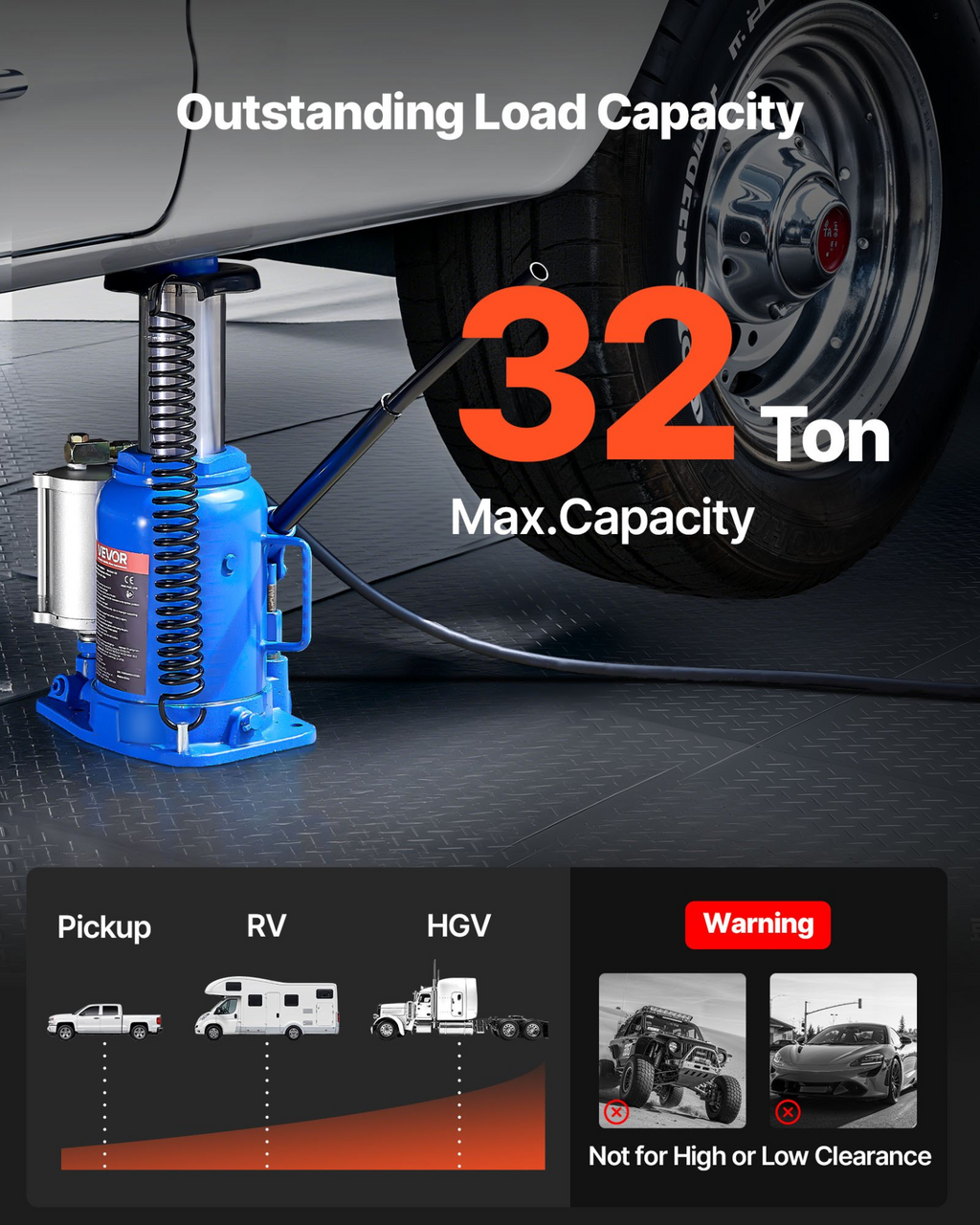 Gato hidráulico de botella VEVOR, capacidad de 32 toneladas (70 546,9 lb), rango de elevación de 10 a 16,3 pulgadas, neumático/manual