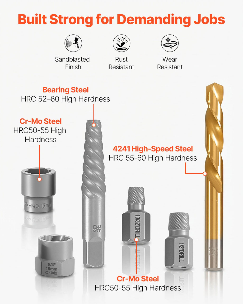 Juego de extractores de tornillos VEVOR con brocas (65 piezas), extractores de tuercas y pernos fáciles de extraer, con adaptadores, estuche resistente