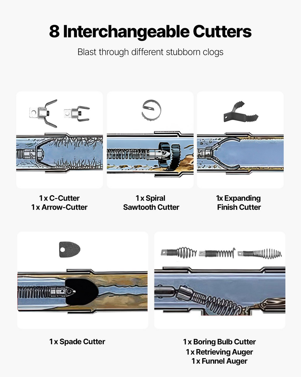 Máquina limpiadora de desagües VEVOR de 100 pies x 1/2 pulgada, desatascador de alcantarillado de alimentación automática, máquina portátil de limpieza de desagües con ruedas de escalada, tambor ajustable, 8 cortadores e interruptor de pie para tuberías de 2" a 6".