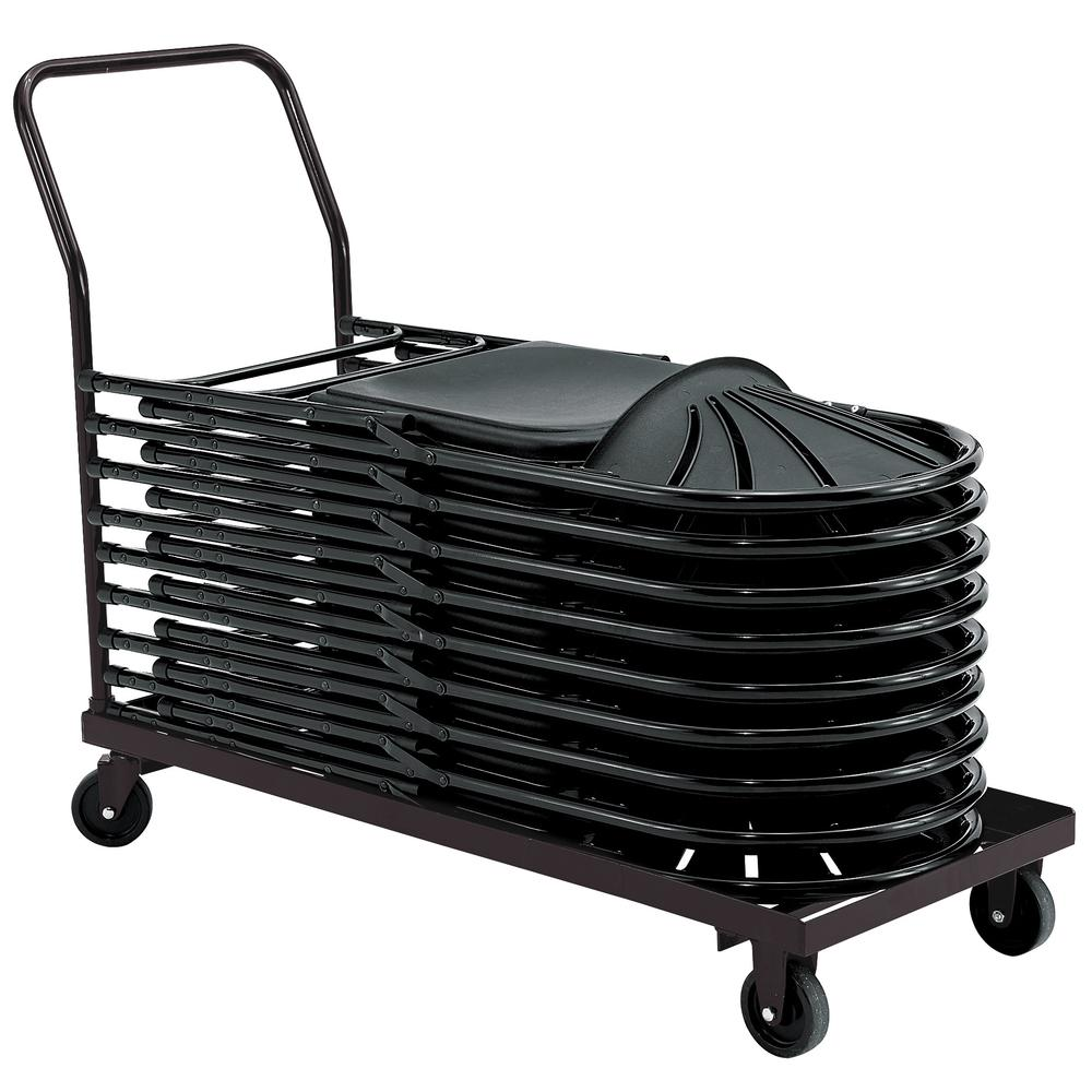 La plataforma rodante DY-1100 puede apilar y transportar hasta 26 sillas plegables NPS Serie 1100. Esta resistente unidad de acero con recubrimiento en polvo marrón de calibre 11 cuenta con cuatro ruedas de nailon (dos giratorias) para facilitar su movilidad en prácticamente cualquier superficie. Cada rueda tiene una capacidad de peso de 125 kg, lo que supone un total de 500 kg.