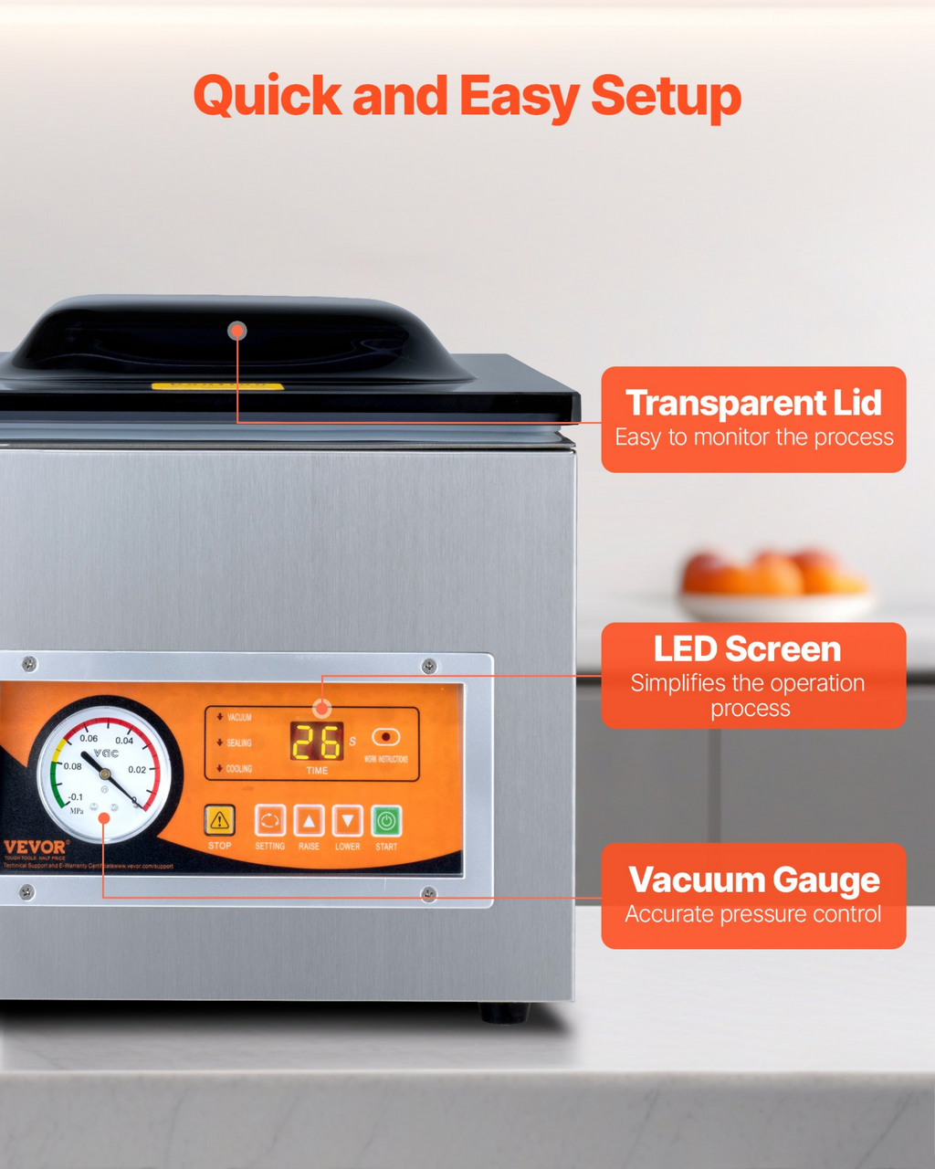 Selladora al vacío de cámara VEVOR, potencia de sellado de 260 W, máquina de envasado al vacío para alimentos húmedos, carnes, adobos y más, tamaño compacto con longitud de sellado de 10,2 pulgadas, aplicada en la cocina del hogar