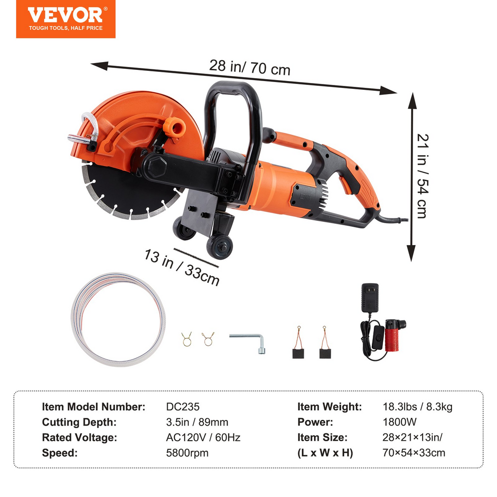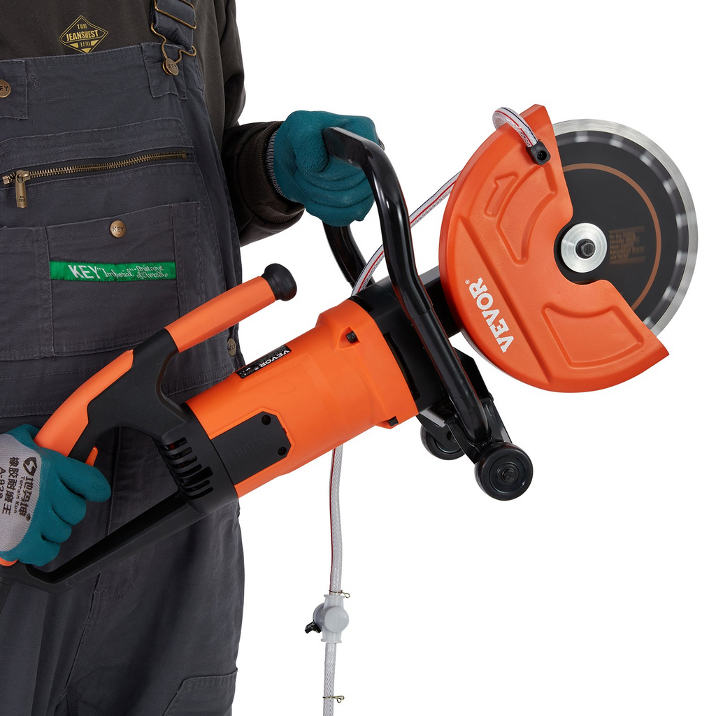 Sierra eléctrica para hormigón VEVOR, 23 cm, motor de 1800 W, sierra circular con 8,9 cm de profundidad de corte, sierra de disco para trabajo en seco y húmedo. Incluye línea de agua, bomba y hoja. Para piedra y ladrillo.