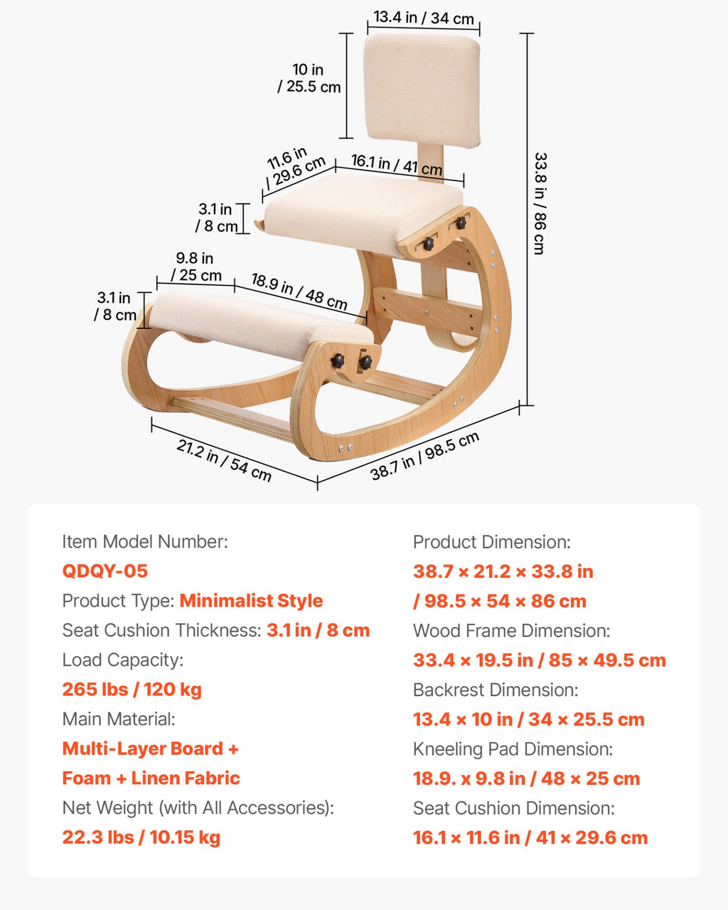 Silla ergonómica de rodillas VEVOR, silla de madera para rodillas con cojines de espuma gruesa ajustables, respaldo y estructura de madera, altura ajustable, alivio para el dolor de cuello o espalda para el hogar, la oficina o la meditación. Tiras inferiores