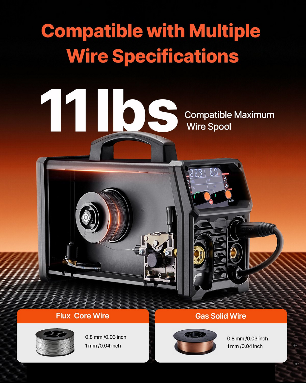 Grosor de soldadura: ≤ 0,59 pulgadas (≤ 15 mm). Tipo de alambre compatible: alambre con núcleo fundente/alambre sólido de gas. Carrete máximo de alambre compatible: 11 lb/5 kg. Corriente de salida: 200 A. Número de modelo del artículo: MIG-200. Peso del producto: 27,3 lb/12,4 kg (incluye todos los accesorios). Funciones: MIG sin gas, MIG a gas, MMA, Lift TIG. Dimensiones del producto: 16,9 x 7,1 x 12,6 pulgadas/430 x 180 x 320 mm, Capacidad de entrada: 6,1 KVA, Diámetro de cable compatible: 0,03 pulgadas / 0,8 mm, 0,04 pulgadas / 1 mm