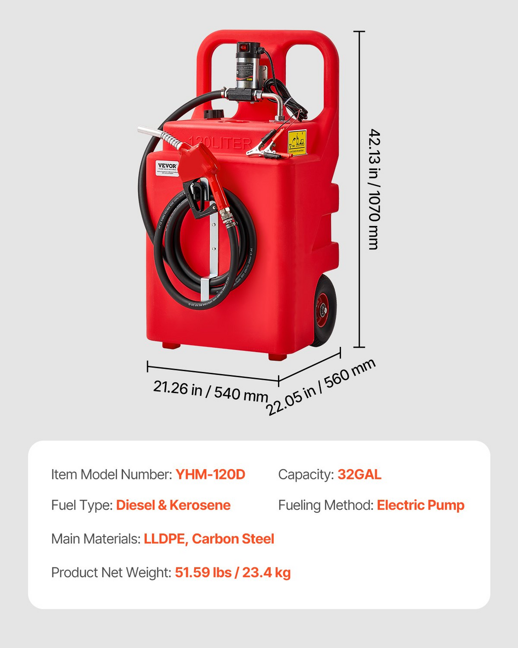 y a prueba de fugas. Uso versátil. Movilidad sin esfuerzo. Materiales principales: LLDPE, acero al carbono. Capacidad: 32 galones. Número de modelo: YHM-120D. Peso neto: 51,59 lb/23,4 kg. Dimensiones: 21,26 x 18,31 x 42,13 pulgadas/540 x 465 x 1070 mm (solo el tanque). Método de carga: Bomba eléctrica. Tipo de combustible: Diésel y queroseno.