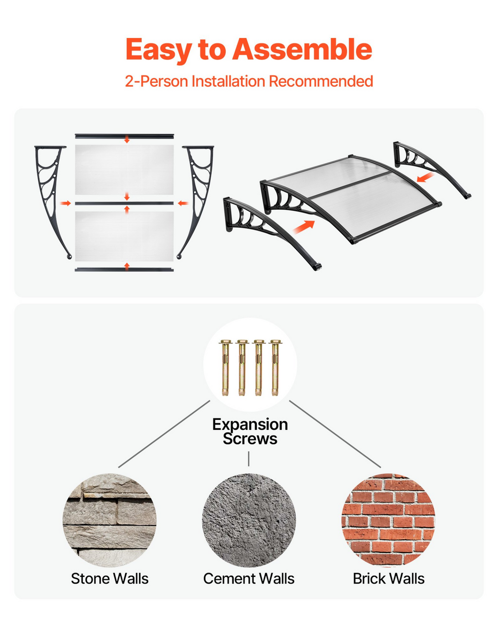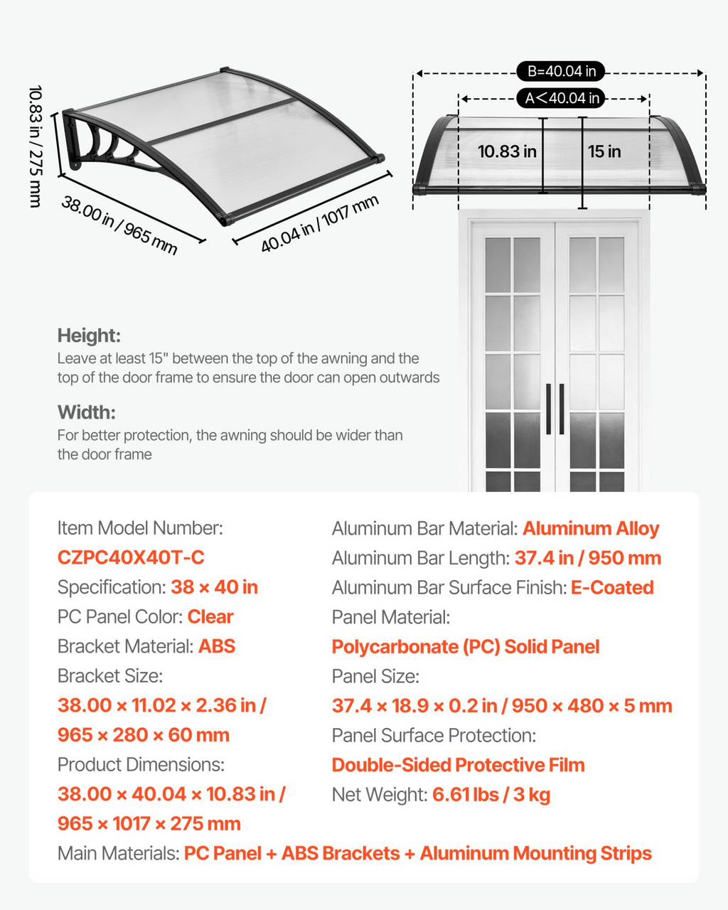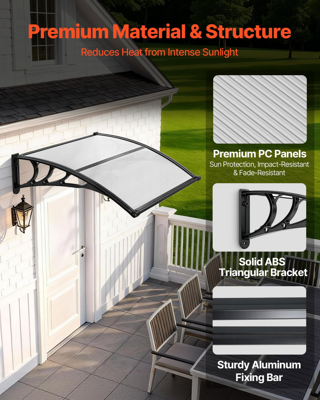 Toldos VEVOR para entrada de puertas, 38 x 40 pulgadas, toldos exteriores para puertas y ventanas delanteras con drenaje y soporte de ABS, protección contra la lluvia, la nieve y el sol, marquesina de policarbonato para porche y patio,