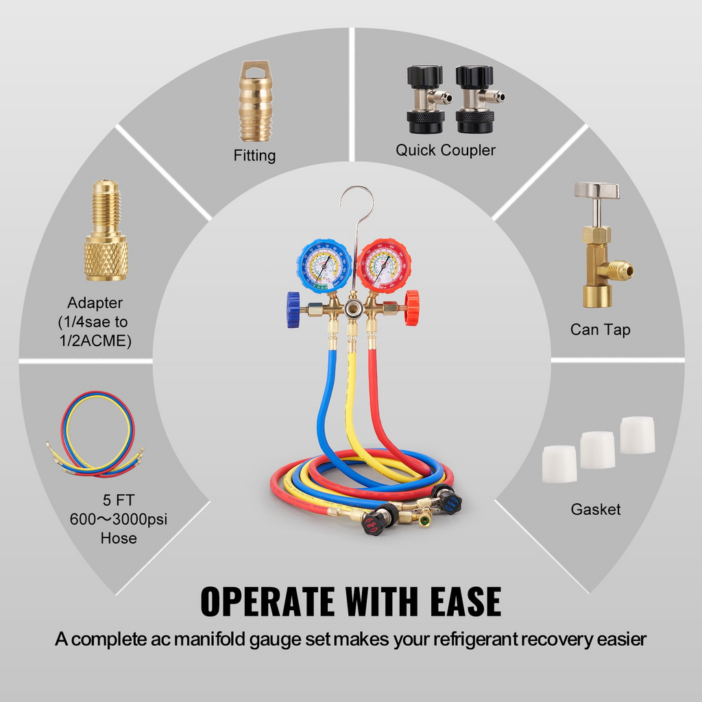 VEVOR Juego de manómetros de CA - Juego de manómetros de colector de CA de 3 vías para refrigerante R134A R22 R12 R502, manómetros de freón con mangueras de 5 pies, acopladores, grifo de lata Funciona en el automóvil Carga y evacuación de freón automático