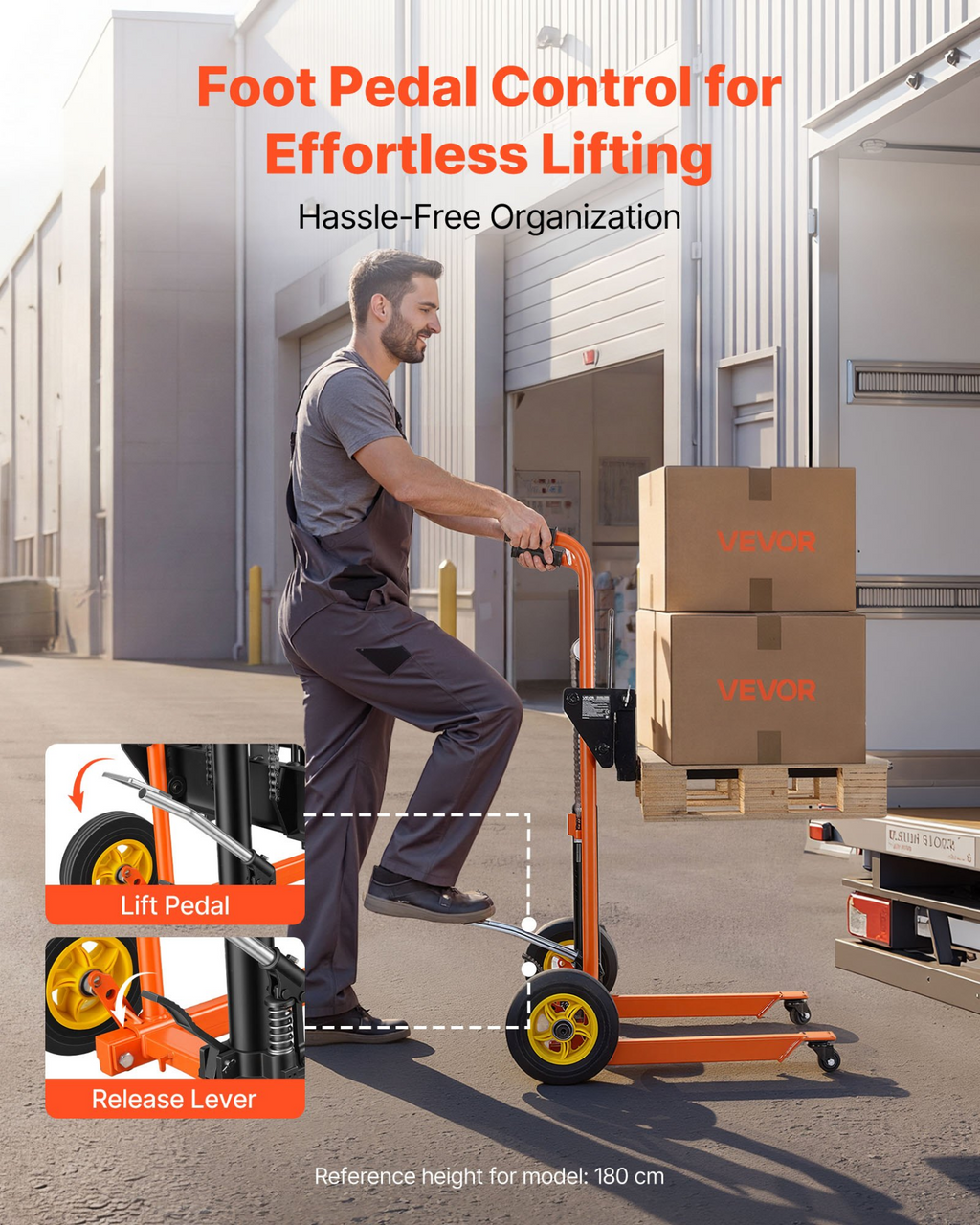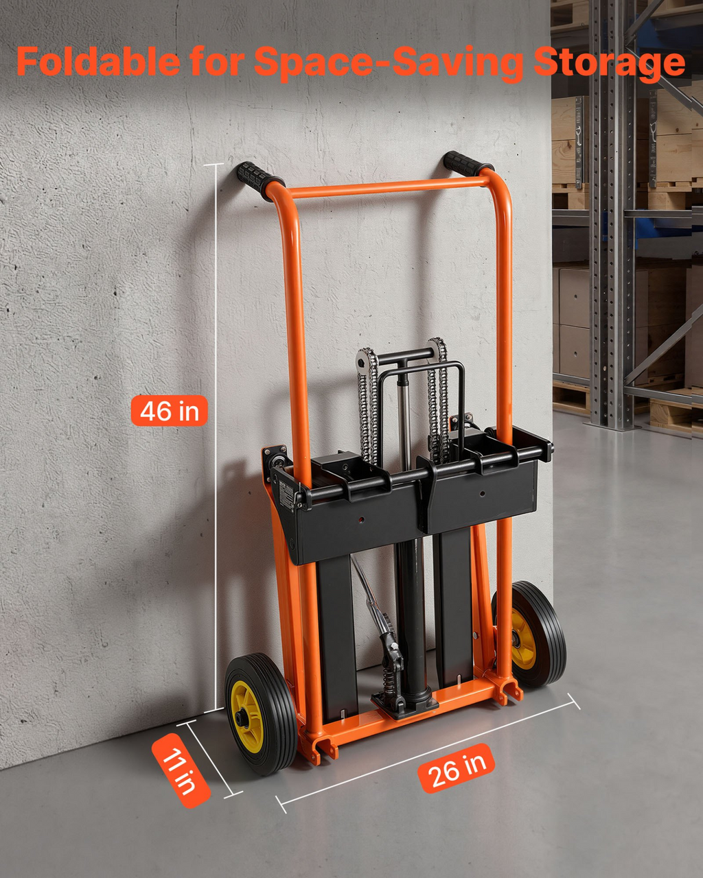 VEVOR Apilador hidráulico con cabrestante para elevación de materiales, capacidad de carga de 204 kg, transpaleta con mesa elevadora de horquilla, altura máxima de elevación de 89 cm, carrito de mesa plegable y portátil, color naranja y negro.