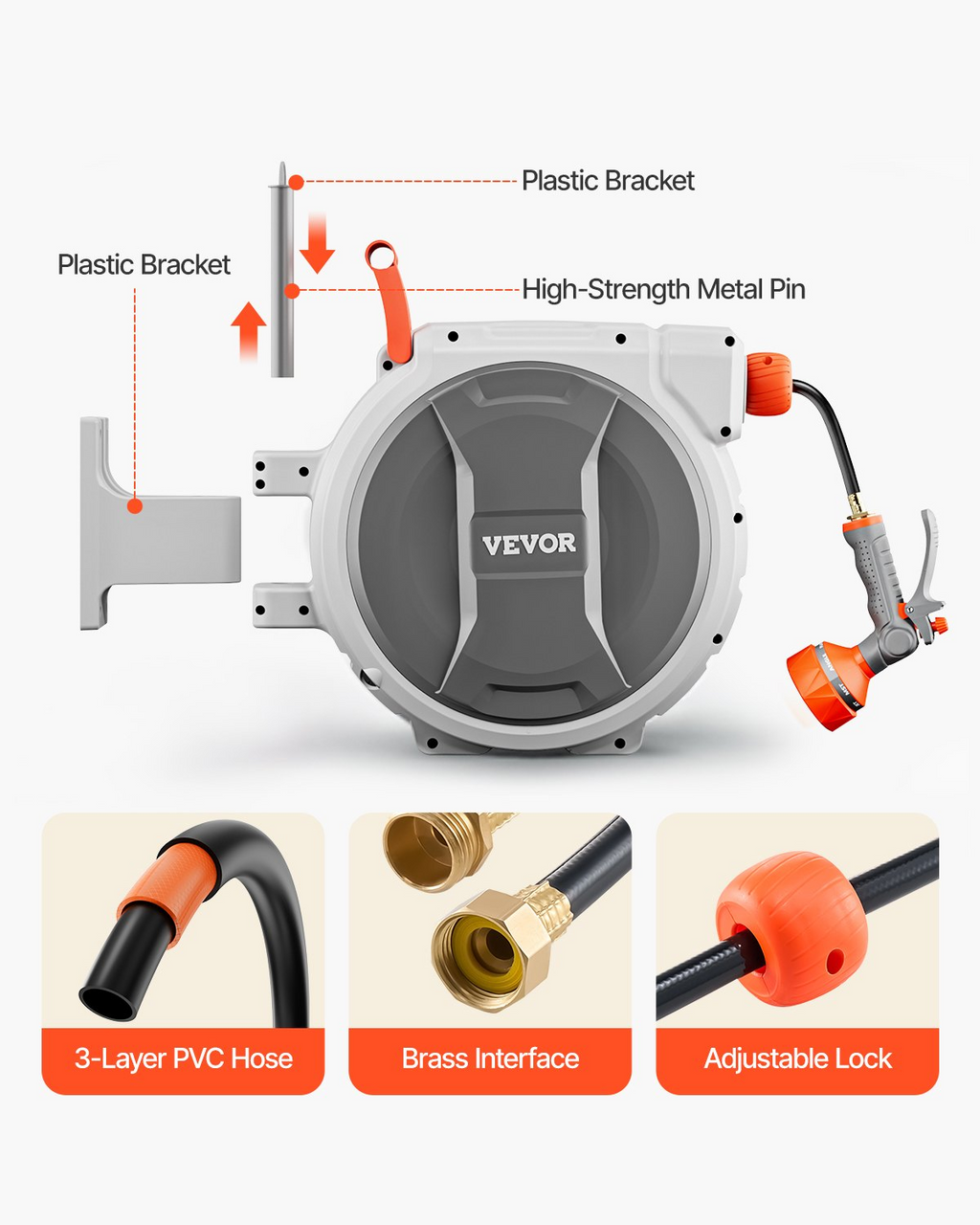 VEVOR Carrete de manguera retráctil para jardín, 1/2 pulgada x 84 pies, para montaje en pared, resistente, con boquilla de 9 patrones, bloqueo para cualquier longitud, sistema de retorno lento mejorado y soporte giratorio de 180°,