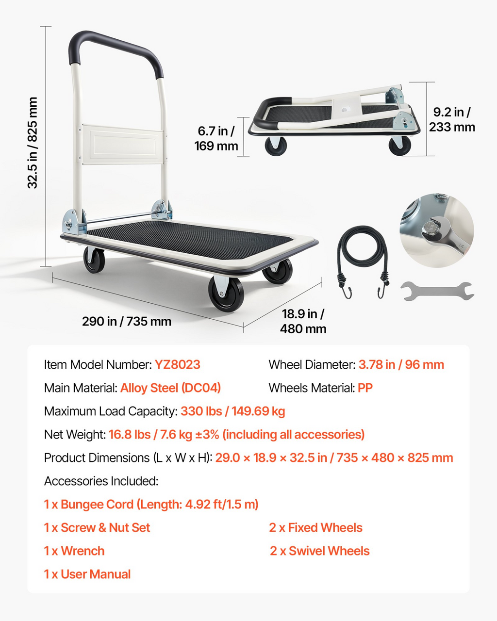 Tamaño de las ruedas: 96 mm (3,78 in), número de modelo: YZ8023, capacidad máxima de carga: 149,69 kg (330 lb), material de las ruedas: PP, material principal: acero de aleación (DC04).