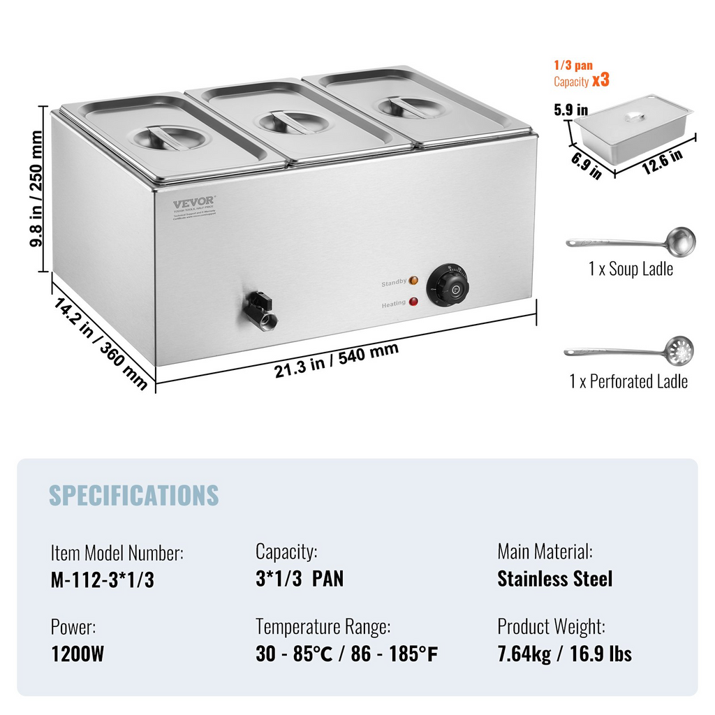Calentador de alimentos eléctrico comercial VEVOR 3 sartenes 17,4 qt baño maría