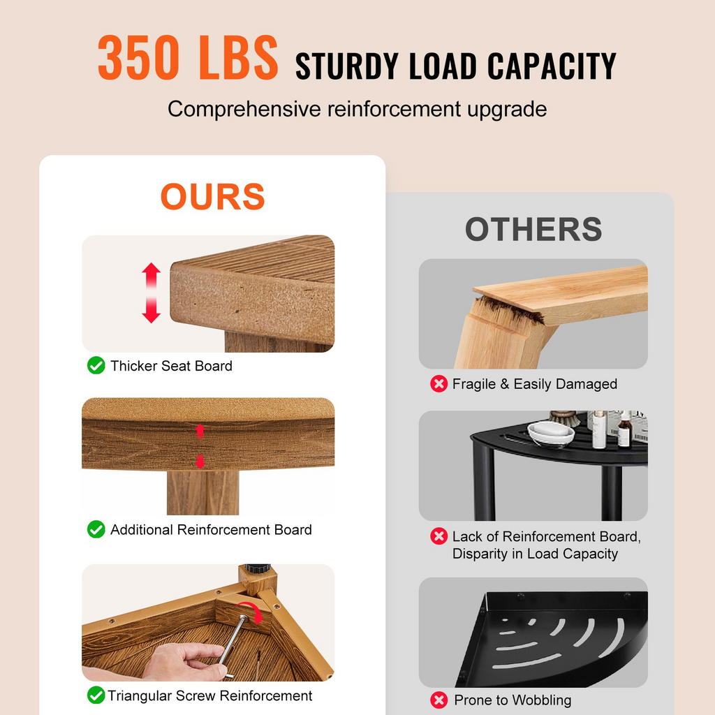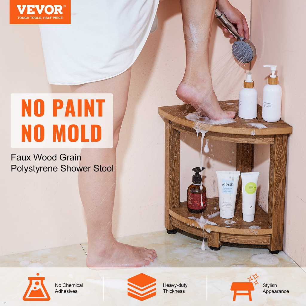 Banco de ducha de esquina VEVOR, 16,5" de alto, radio de 12,8", poliestireno con veta de madera sintética, 350 libras con estante de almacenamiento, resistente al agua, taburete de ducha para ducha interior y exterior, para baño, sala de estar