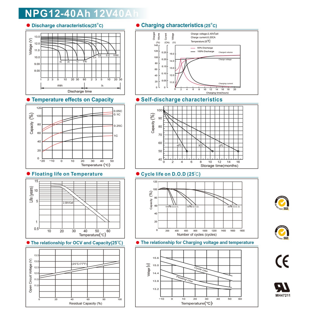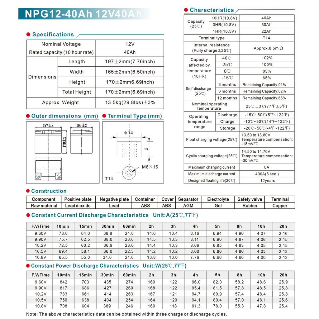 Capacidad: 40 Ah, Voltaje: 12 V, Número de modelo del artículo: NPG12-40Ah, Peso del producto: 24,3 libras / 11,0 kg, Dimensiones del producto: 7,8 x 6,5 x 6,7 pulgadas / 197 x 165 x 170 mm, Temperatura de descarga: 5 ℉ a 122 ℉, Temperatura de almacenamiento: -4 ℉ a 122 ℉