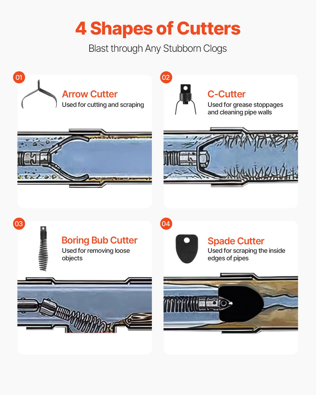 Máquina limpiadora de desagües VEVOR de 30 m x 19 mm, desatascador de alcantarillado con alimentación automática sobre ruedas, máquina portátil para limpieza de desagües con 4 cortadores e interruptor de pie neumático para tuberías de 10 a 20 cm.