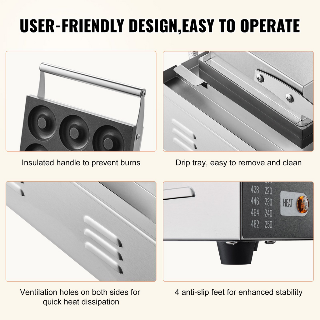 VEVOR Máquina eléctrica para hacer donas, 1550 W, máquina para hacer donas comercial con superficie antiadherente, máquina para hacer gofres con 6 agujeros y doble cara, para hacer 6 donas, temperatura de 122 a 572 ℉, para uso en restaurantes y en el hogar