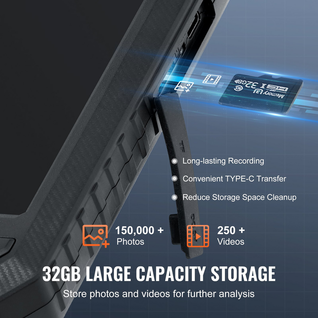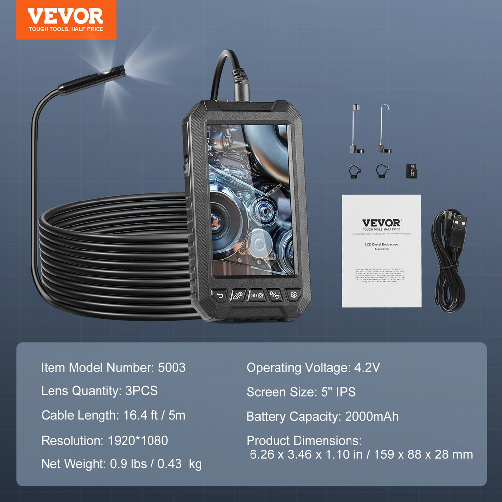 Cámara endoscópica VEVOR con luz, endoscopio industrial de triple lente, cámara de inspección de 5" con pantalla 1080P, 8 + 2 luces, cámara serpiente impermeable IP67 para automoción y fontanería (cable de 5 m, tarjeta de 32 GB)