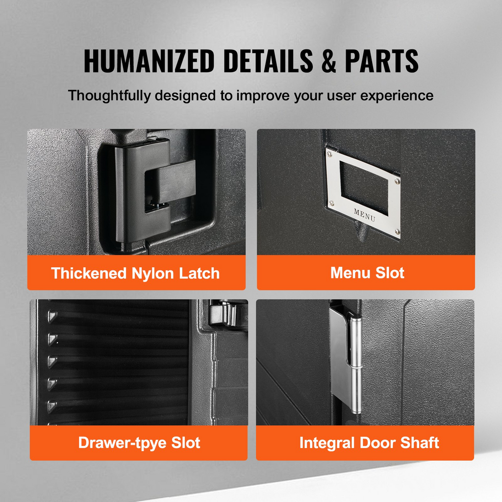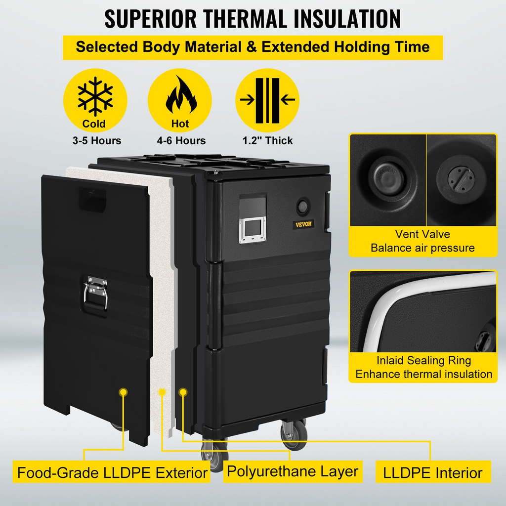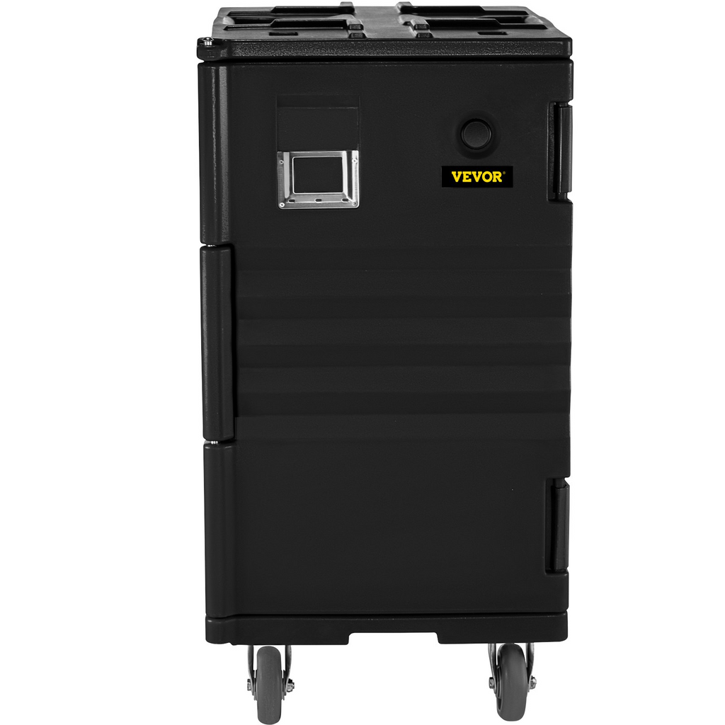 VEVOR - Portador de recipientes para alimentos con aislamiento, caja caliente de 109 qt para catering, portador de caja de alimentos LLDPE con hebillas dobles, calentador de alimentos de carga frontal con asas, cargador final con ruedas para restaurantes, cantinas, etc. Color negro