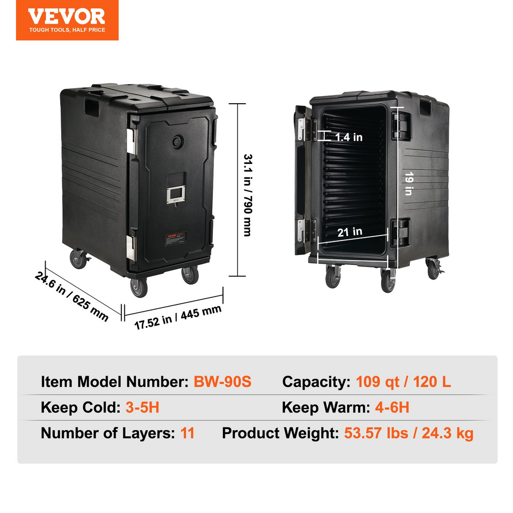 Dimensiones exteriores: 625 x 445 x 790 mm / 24,6 x 17,52 x 31,1 pulgadas, Tipo de energía: No eléctrico, Número de capas: 11, Mantiene caliente: 4-6H, Dimensiones internas: 21 x 13 x 19 pulgadas, Espaciado entre capas: 1,4 pulgadas / 36 mm, Mantiene frío: 3-5H, Color: Negro, Material: LL9450UP, Tipo de carga: Carga frontal, Capacidad: 114QT / 120L, Número de modelo del artículo: BW-90S, Peso del producto: 53,57 lbs / 24,3 kg