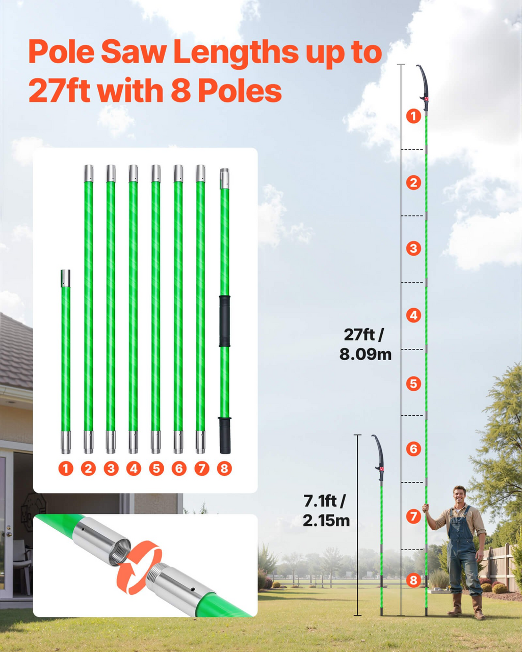 Sierra de pértiga manual VEVOR, podadora de árboles extensible de 1,2 a 8,2 m, hoja afilada de acero de 65 Mn, mango ligero de fibra de vidrio