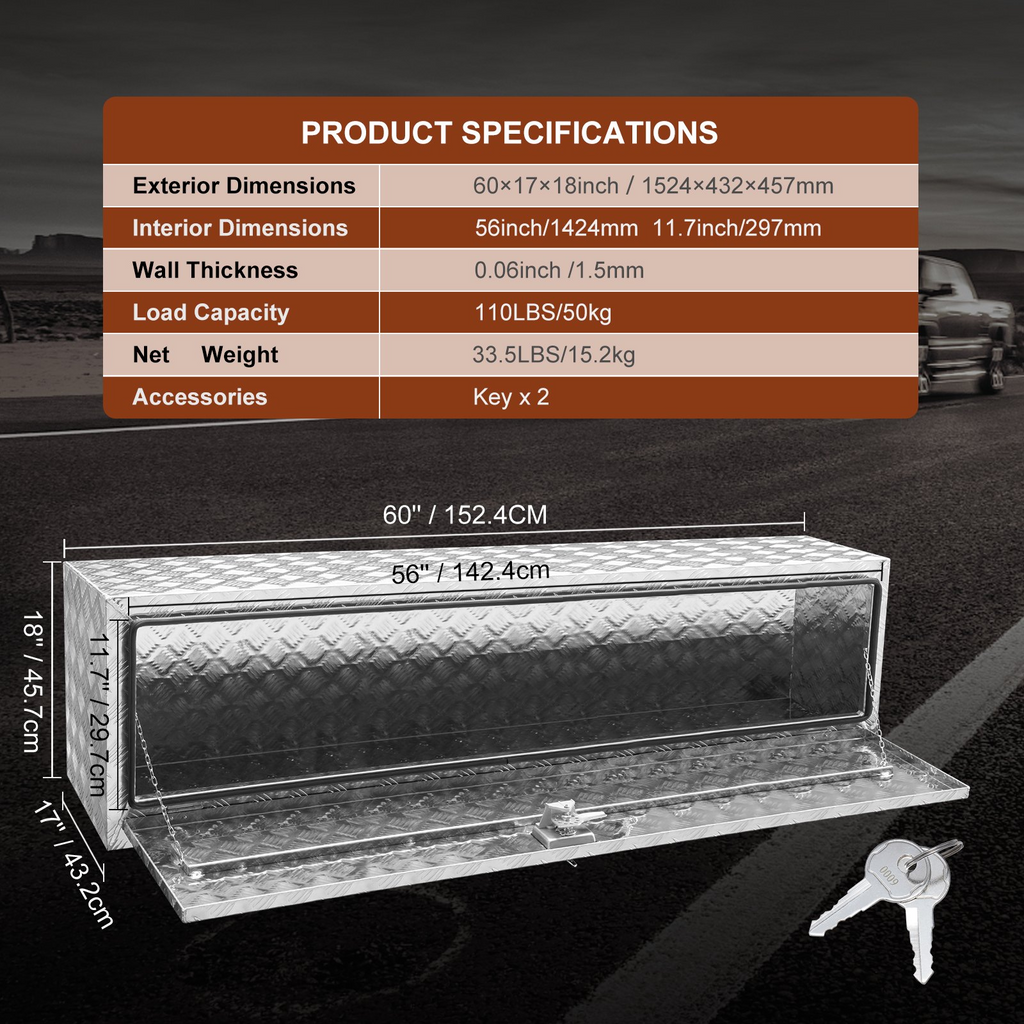 Caja de almacenamiento inferior para camioneta VEVOR, 60"×17"×18", caja de almacenamiento para camioneta, caja de herramientas de aluminio resistente con placa diamantada, cerradura y llaves, caja de almacenamiento impermeable para remolque con pestillo de manija en T para camión, furgoneta, remolque.