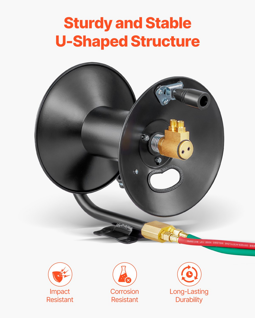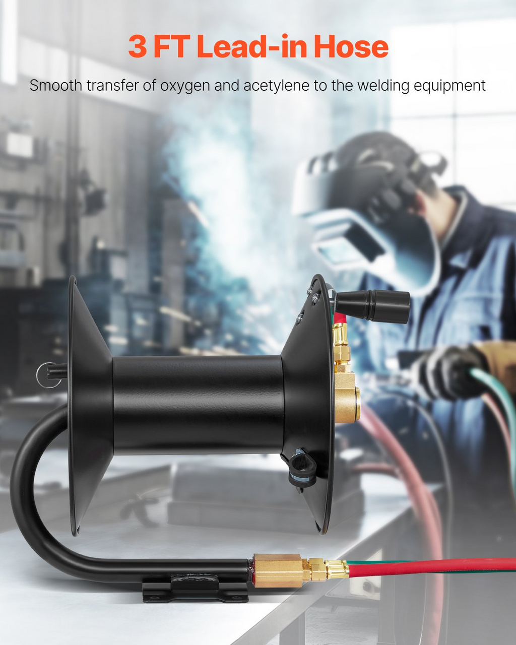 Carrete para manguera de soldadura VEVOR, con rebobinado manual mediante manivela, manguera de entrada de 91 cm (3 pies) y conexiones B de 9/16"-18, carrete de acero resistente para montaje en techo/pared,