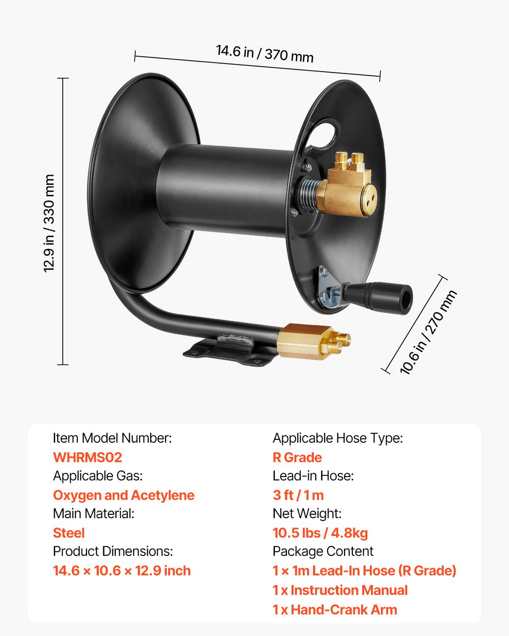 Gas aplicable: oxígeno y acetileno. Manguera de entrada: 3 pies / 1 m. Número de modelo: WHRMS02. Tipo de manguera aplicable: Grado R. Dimensiones del producto: 14,6 x 10,6 x 12,9 pulgadas / 370 x 270 x 330 mm. Peso neto: 10,5 libras / 4,8 kg. Material principal: acero.